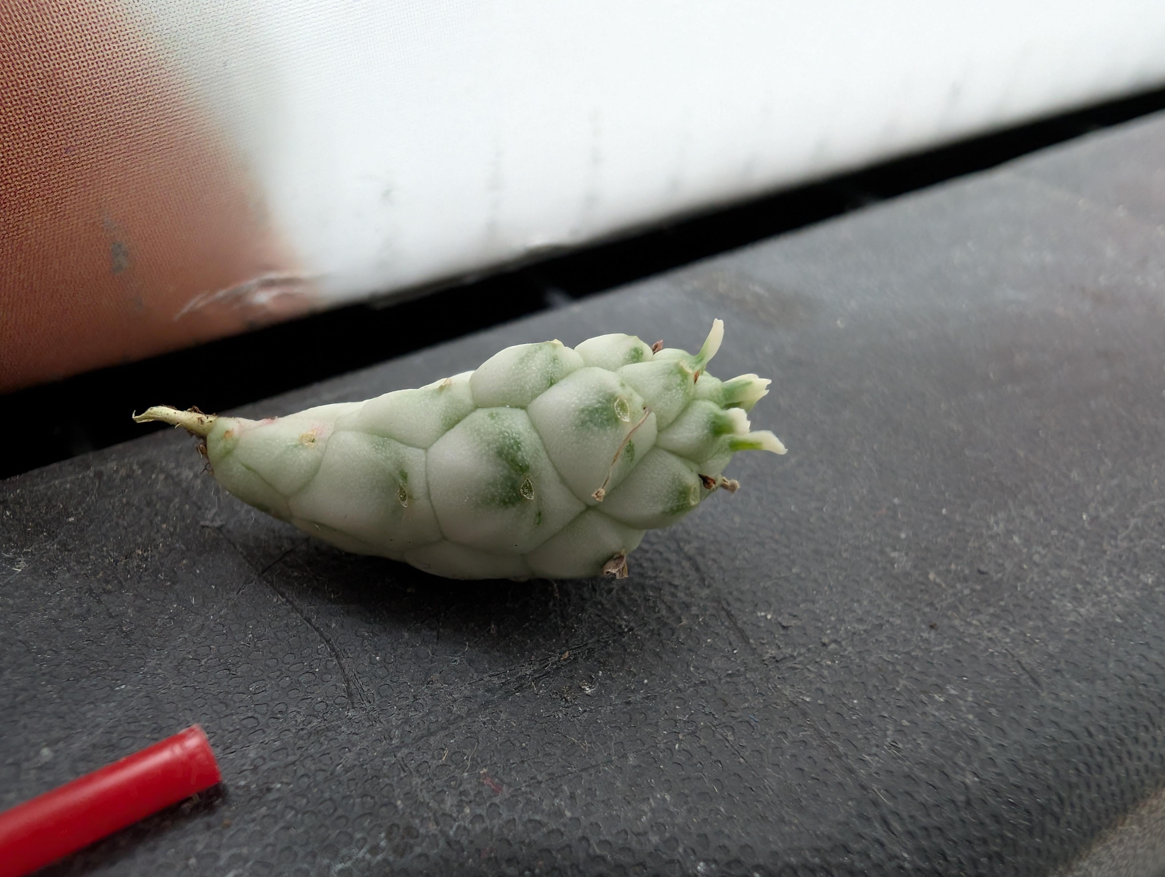Monadenium stapelioides AKA Pineapple Tree – although, not sure if the white is a special species. The left is the bottom, the right is the top. I would stick the bottom in soil and treat it like a succulent. Mine is small, but likes to nearly dry out. They love sun, and will grow leaves (the little protrusions on the top are the leaves starting)