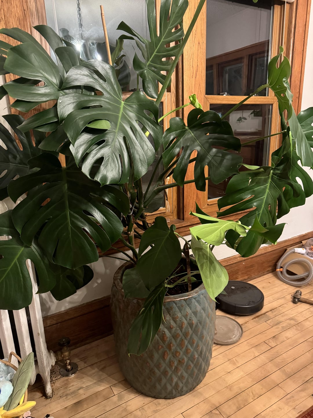 Anyway my real question for the experts out there because I’m clearly not! Is this pot going to rot the roots? I’m expecting to water it way less, but I really don’t want to kill it. It’s so tall and is not very full at the bottom. Every few months I get new leaves and I just think without a strong root system it’s going to get too tall and adding in poles is just more of an eye sore than anything.