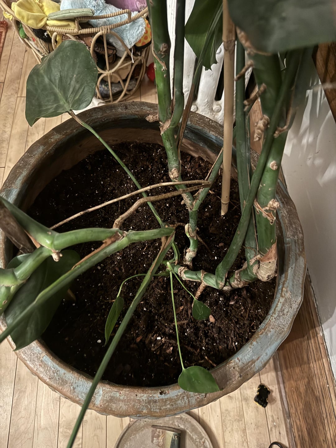 This guy has got so out of control with aerial roots growing everywhere in my dining room so I assumed it was needing more support for how tall it was getting, beyond the sticks I was using to hold it up. So I ended up eyeballing it at Menards and bought way too big of a pot. I held off for months repotting because I was so scared to kill it. I finally just did it today and seeing the amount of soil I needed had me second guessing. I ended up smashing the original pot with a hammer around the plant bc I couldn’t get it out and didn’t want to pull the roots too hard.