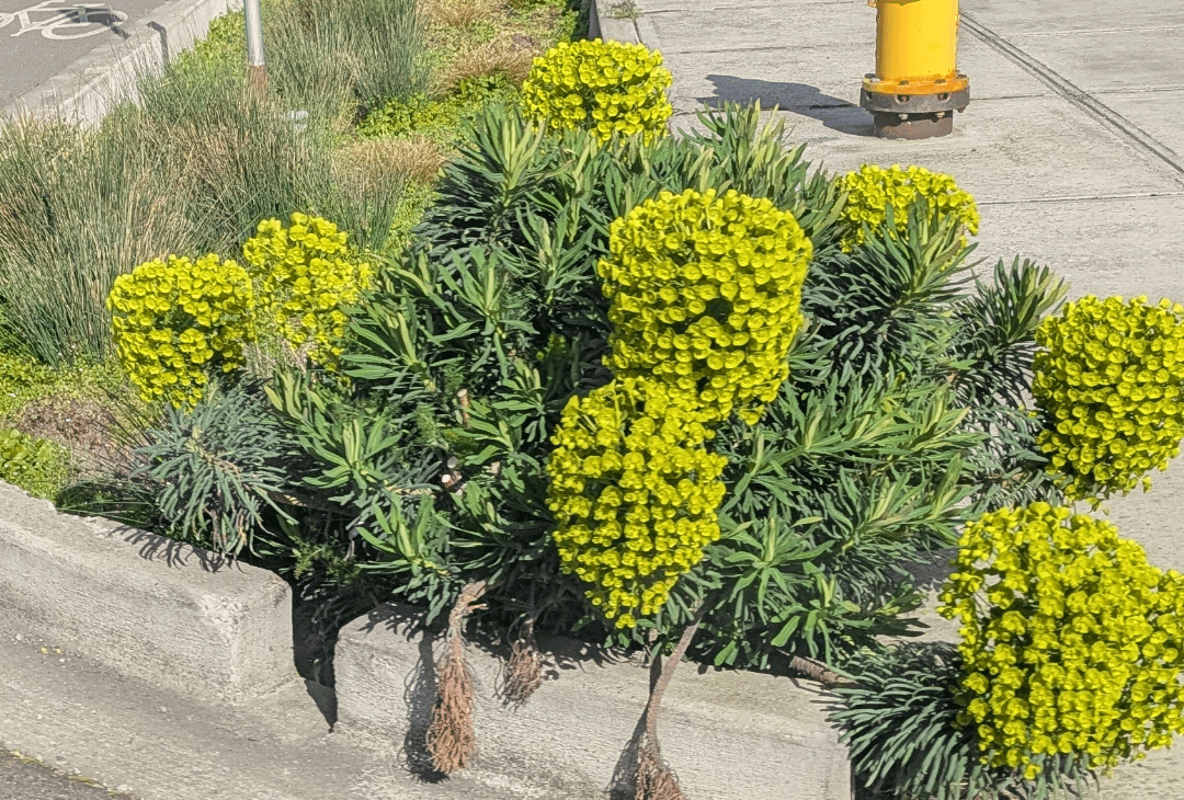 The Mediterranean spurge (Euphorbia characias) is a hardy, drought-tolerant evergreen shrub. t’s appreciated for its resilience and distinctive, long-lasting floral displays. [https://plants.ces.ncsu.edu/plants/euphorbia-characias-subsp-wulfenii/](https://plants.ces.ncsu.edu/plants/euphorbia-characias-subsp-wulfenii/)