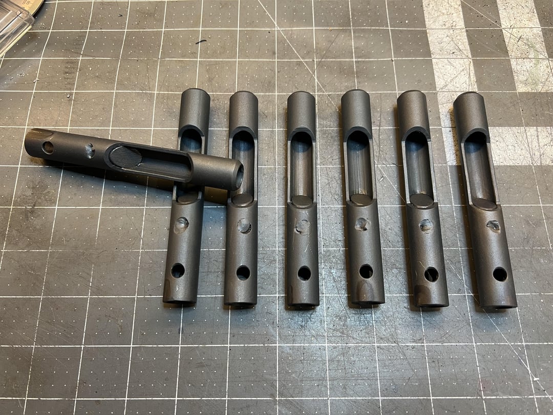 Rigged up a ghetto wood handle for a quick “Alpha” test. Works pretty well but the tines hit the ground at about a 30 degree angle and preventing full penetration so only getting about 4-5cm (2ish)” instead of the full 8cm (just above 3”). The low angle also forces the pluggs in between the discs messing with the ejection. So need to move the spacers a bit for a more aggressive angle.