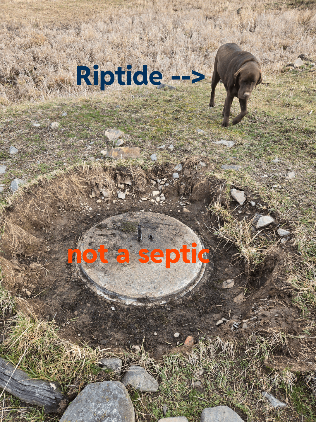 A few guesses were right. Most were wrong (thankfully!) this isn’t a crap catcher lid. It’s a homemade ranch stock tank. Poly pipe gravity feeds from a nearby stream, and the other one goes back to another, lower stream, for overflow. Neat idea, we assume they used to rotate the sheep into smaller pastures way back when.