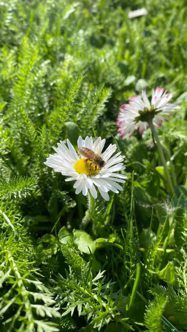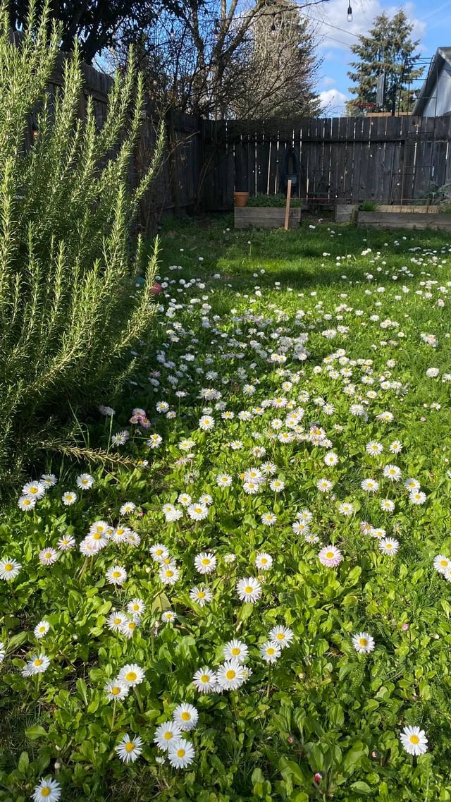 Looks great. I have English daisies in my lawn as well. They look great in the early spring but they’re awful in the summer. The seed heads pop up constantly and when you walk on the lawn it feels like hundreds of bugs flying into your legs. I mow them down but they come up faster than I can mow them.