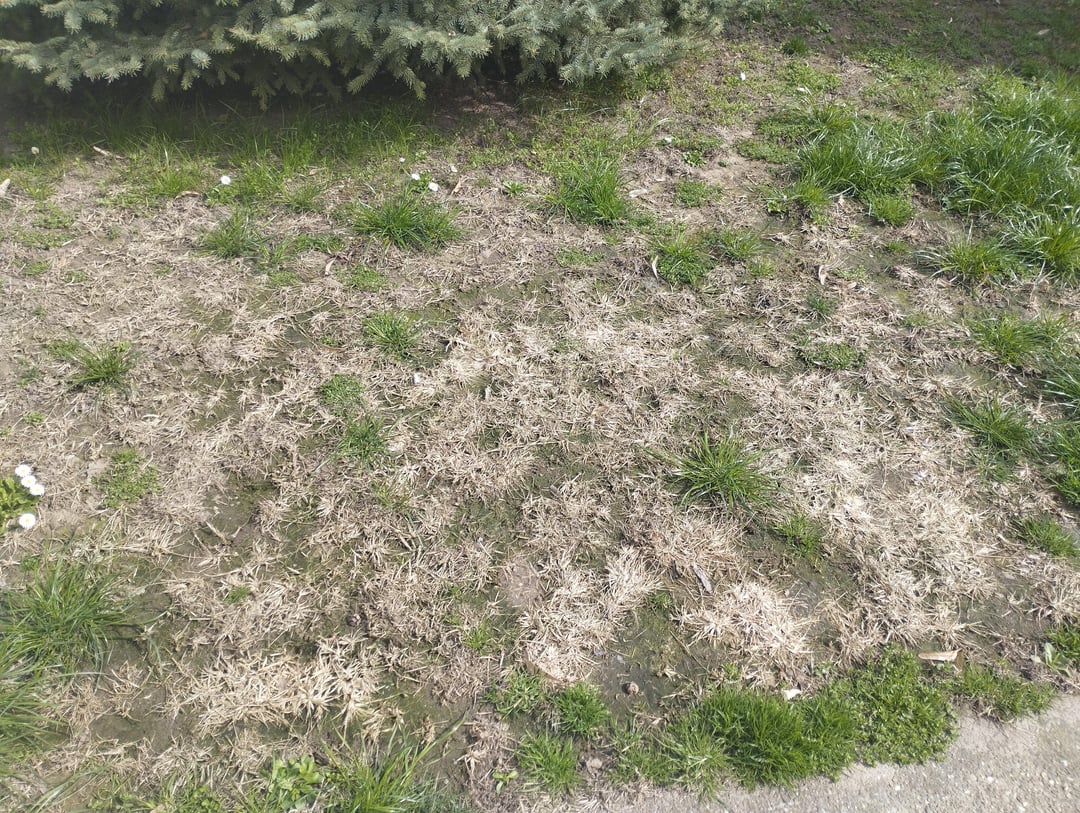 The grass started dyeing a few months back and we didnt know what to do so we dug up the soil and turned it upside down (i dont know if there is a term for it in English) and planted new grass seeds. This is that new grass a few months later, looking even worse. The ground under the dead grass is greenish, almost like there are algae or some moss growing there. We would appreciate any help regarding the problem, and are also wandering if this would affect any new bushes planted here?