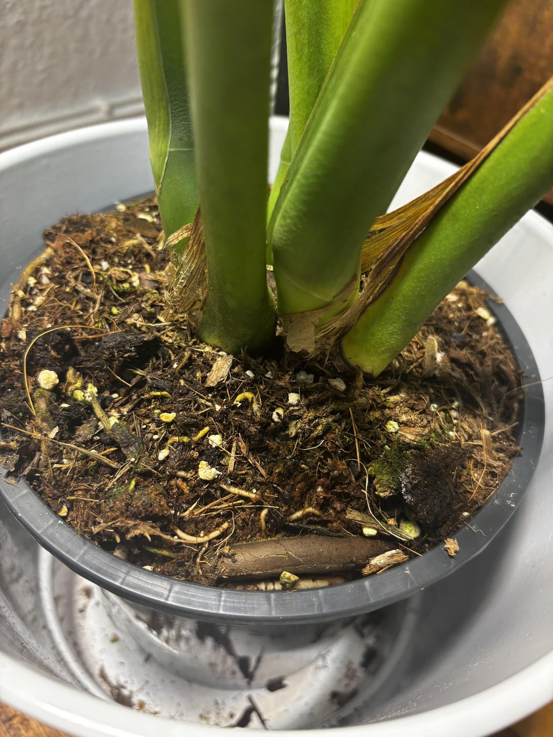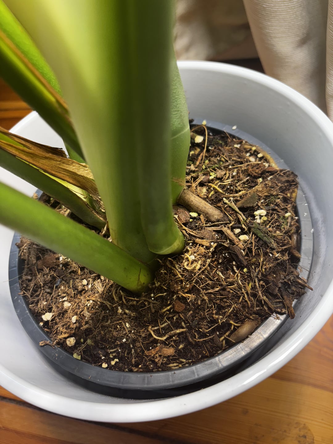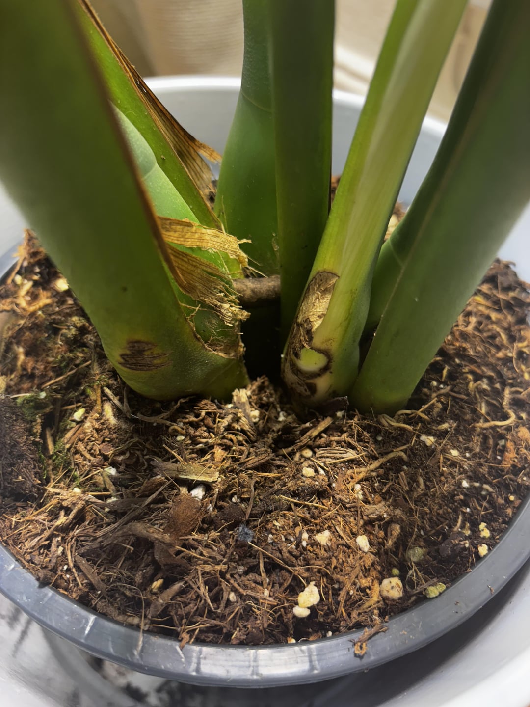 I can see aerial roots under the dirt, should I remove it or try to bend them out?