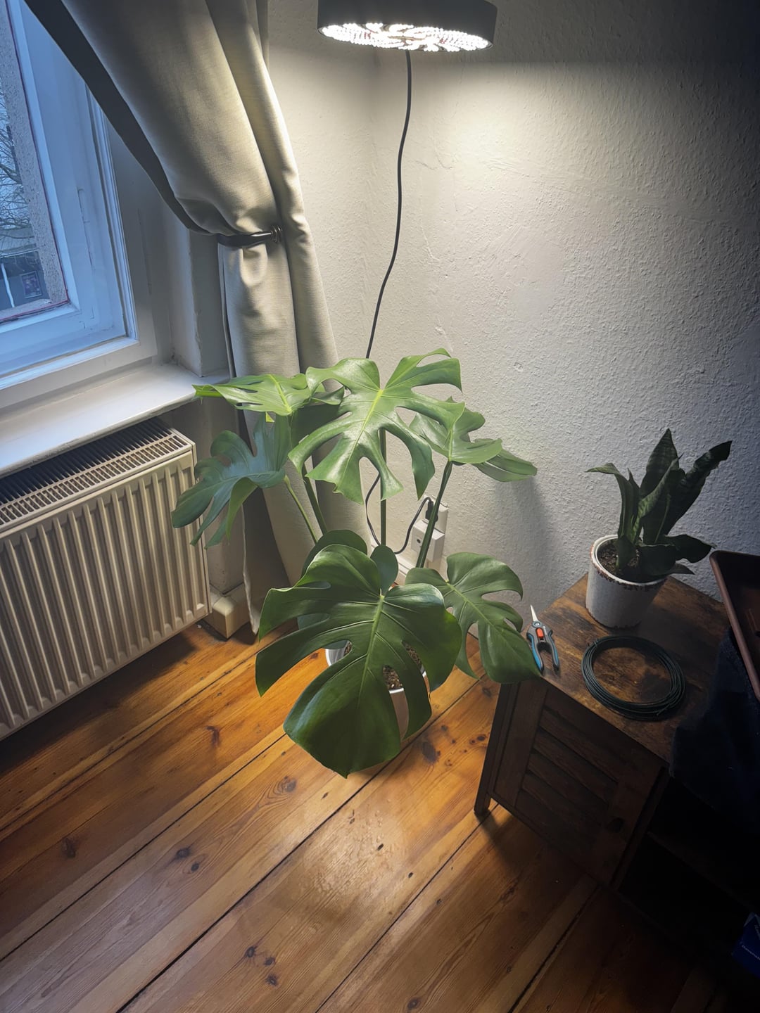 Light looks great, mine is under a similar grow light and is doing well, I put mine on a moss pole, and it has that more uniform growth which I like. You can technically train the leaves gently but they tend to always try and face the light.