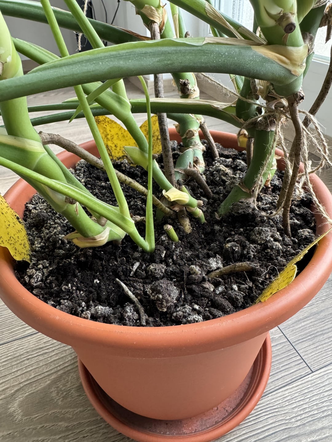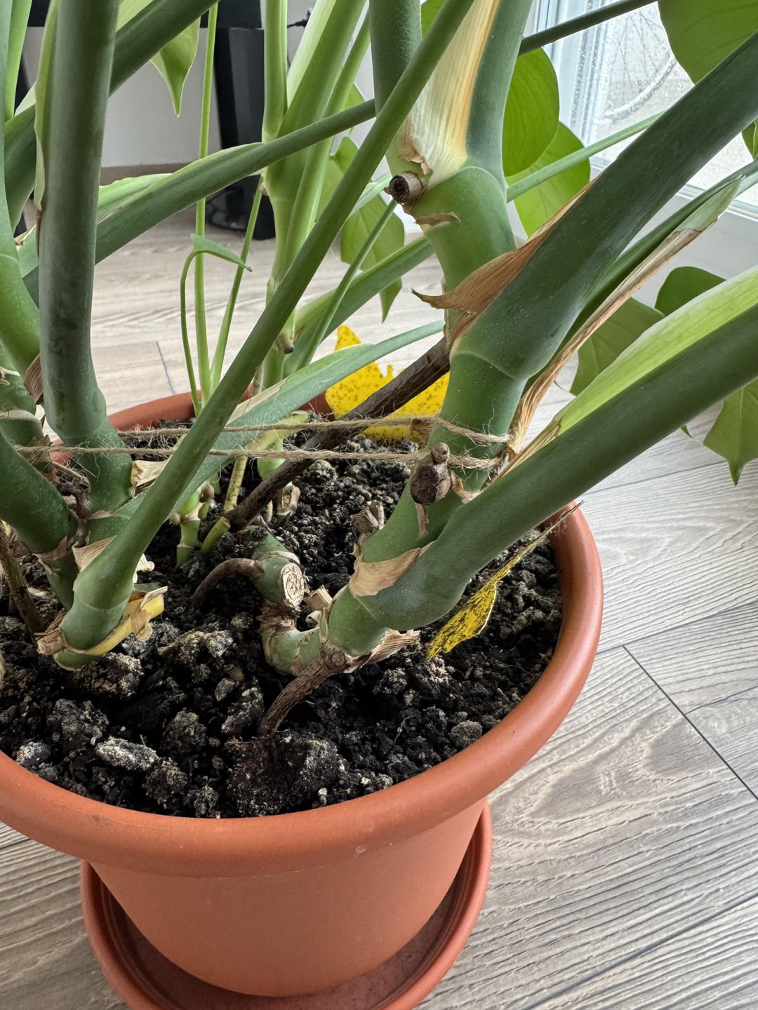 It’s really beautiful, you’re a good monstera parent. If it were mine, I would separate back to two vines per pot just knowing how huge they can get.