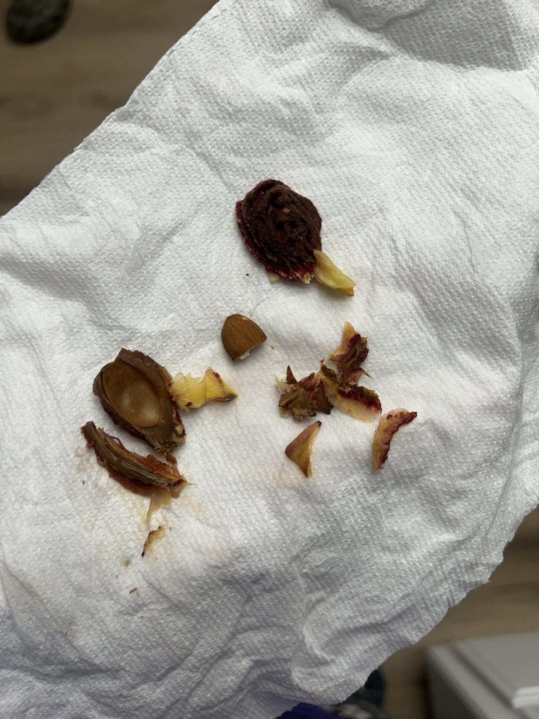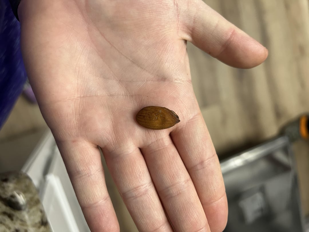 It’s a peach kernel. Very similar to an almond. They’re in the same family. Almonds just lack the thick fleshy fruit that peaches do. Their thin fruit and pit husk just split open and the little almond falls out.