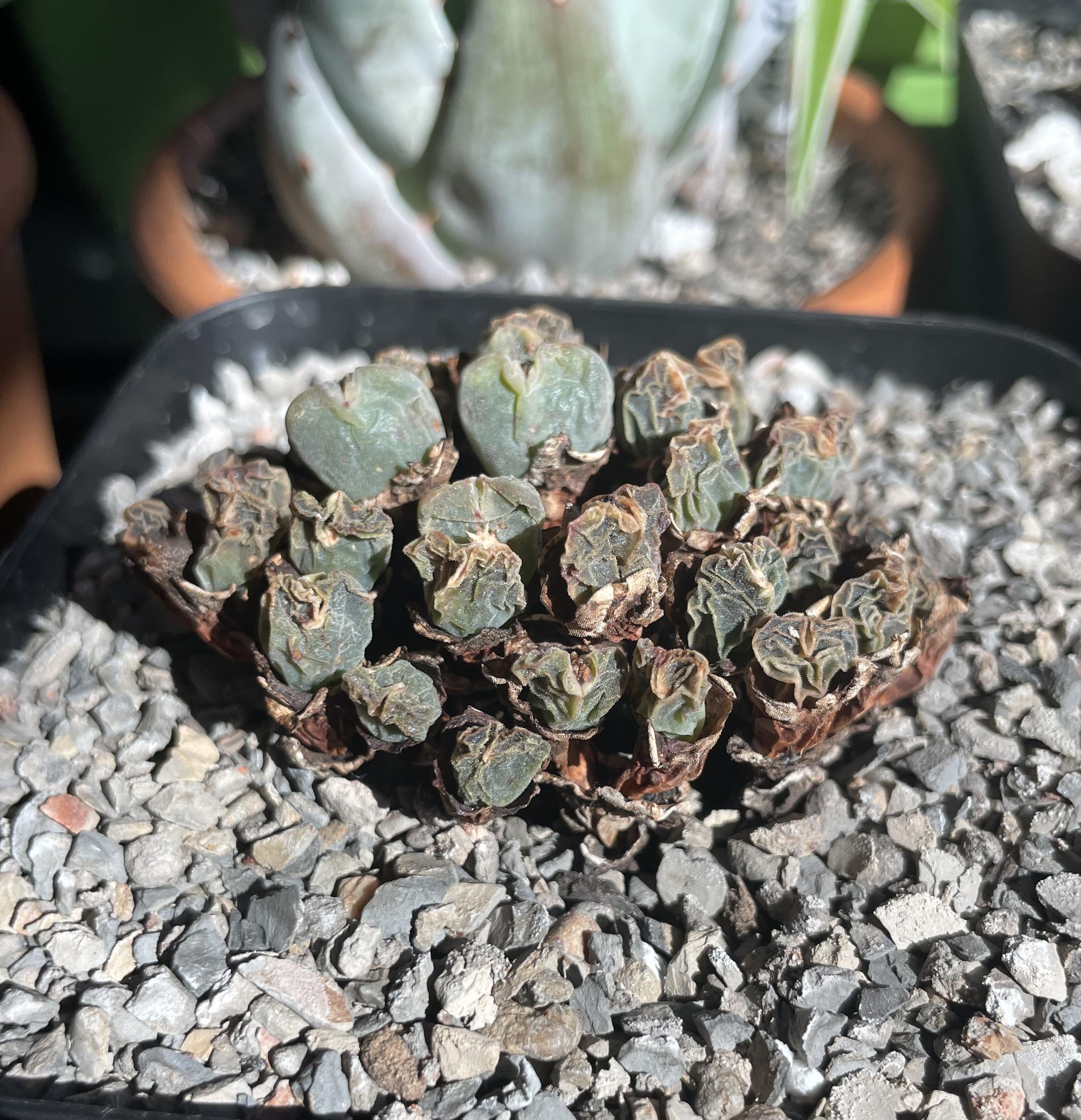 Hey Mesemb friends, I am a noob to Conophytum and were questioning if this recently repotted *C. luiseae* is genuinely suffering, or moving into dormancy. Its in a 90% inorganic mix, and only watered once since its repotting a moth ago, as I am very unsure where the slow to stop watering for dormancy period begins. I am not finding any other photos of *C. luiseae* that look like this, so now i’m under the impression I killed it š I have touched the heads, and they have some integrity. But maybe its because I dried them to death, or they never acclimated properly. Give it to me straight, I want to be good at these.