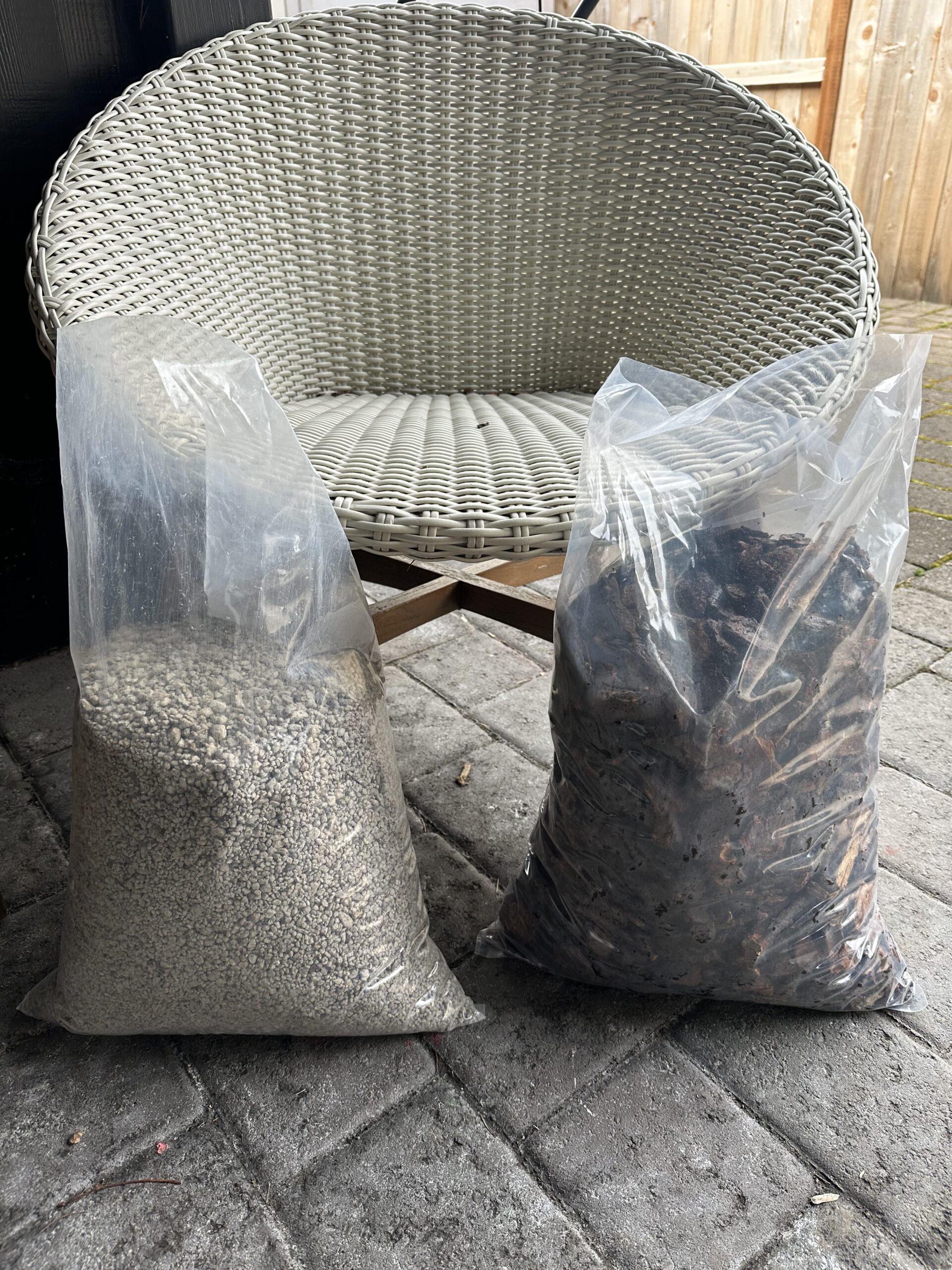 In my quest to never shop at Amazon, Home Depot, or Lowe’s, I stopped at a lansdcape supply place this afternoon and convinced them to sell me the smallest possible quantities of pumice and big chunky bark. I’m talking mountains of the stuff in a parking lot with dump trucks and forklifts driving around. They were kind enough to shovel these into bags for me and it cost $23 total which I can’t honestly tell if that’s a good deal or not but these bags are HEAVY and will last me ages.