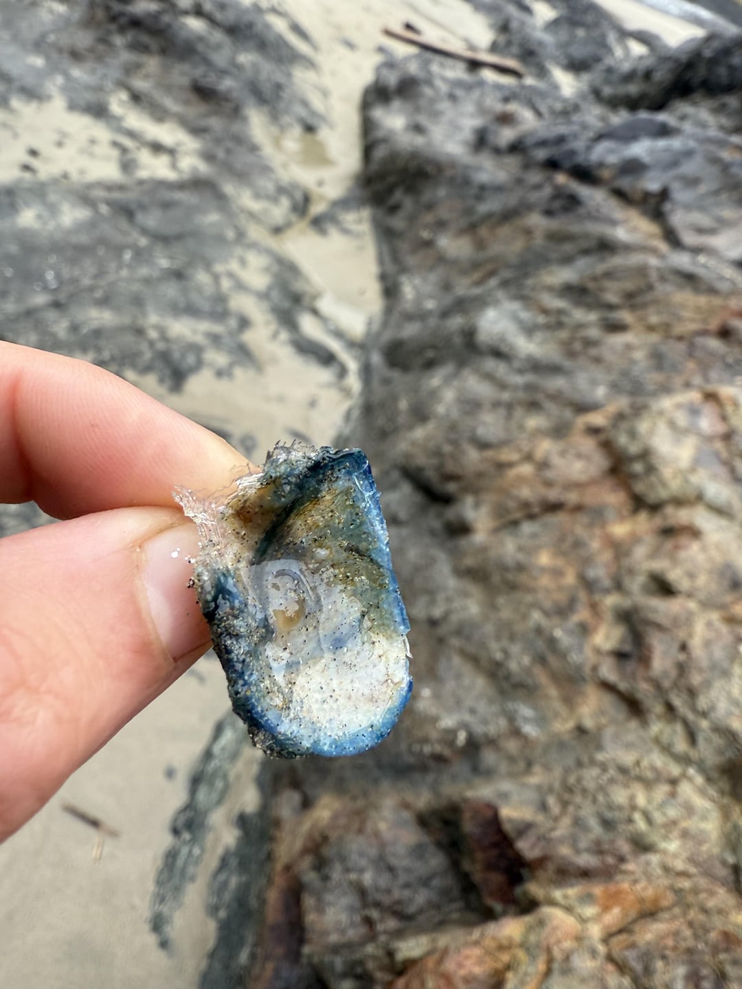 It’s very benign—flexible like plastic, no fishy smell, -all clear except for second photo (blue). Probably about 20 of them at lower tide. Near an estuary.
