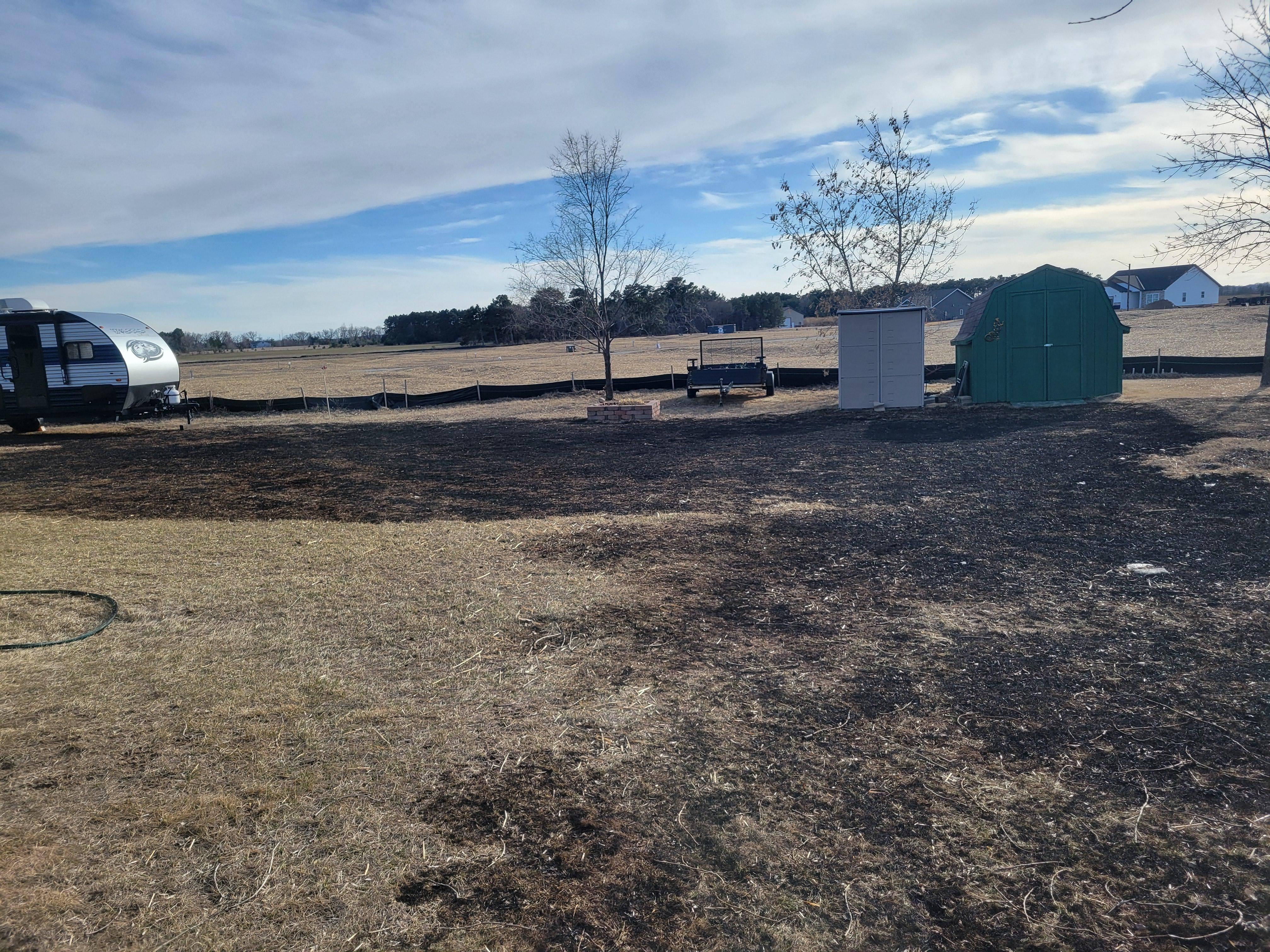 Neighbor had a fire going in their fire pit and lit their yard on fire, which then spread and burned most of my back yard (no property or people damage thankfully). It's late March and I'm in central Minnesota… What should I do at this stage to help out come back healthier than ever?
