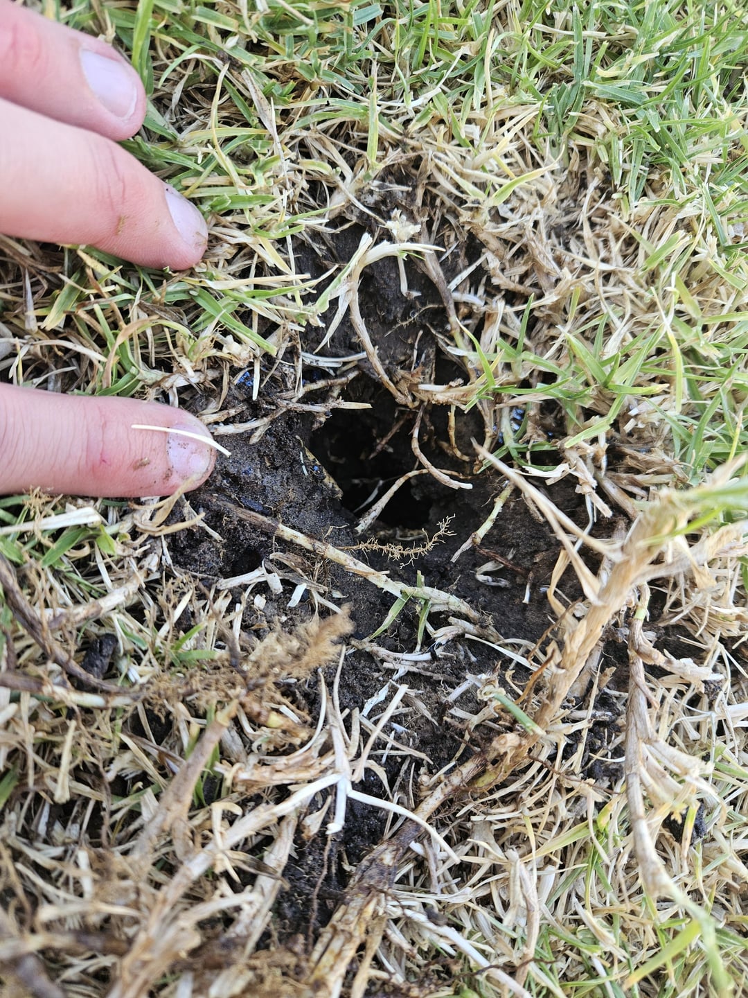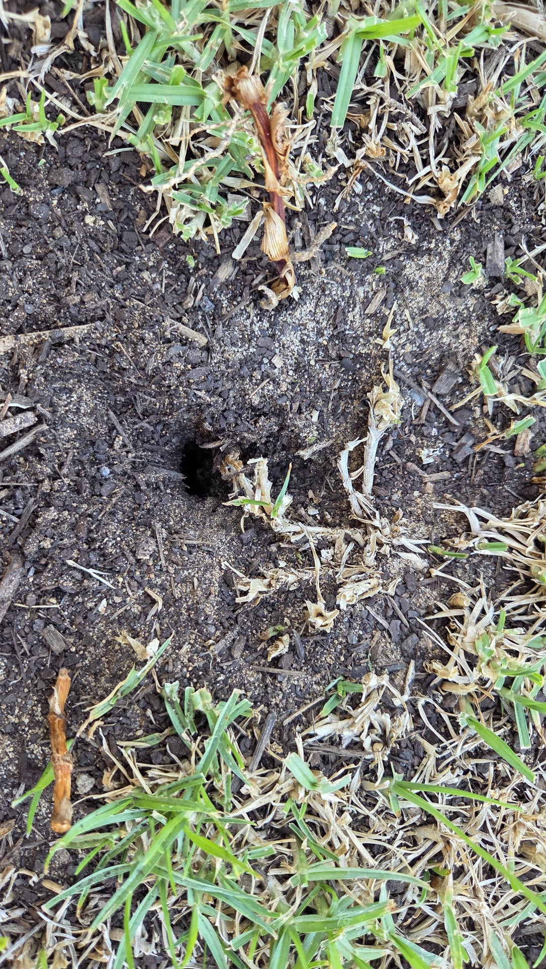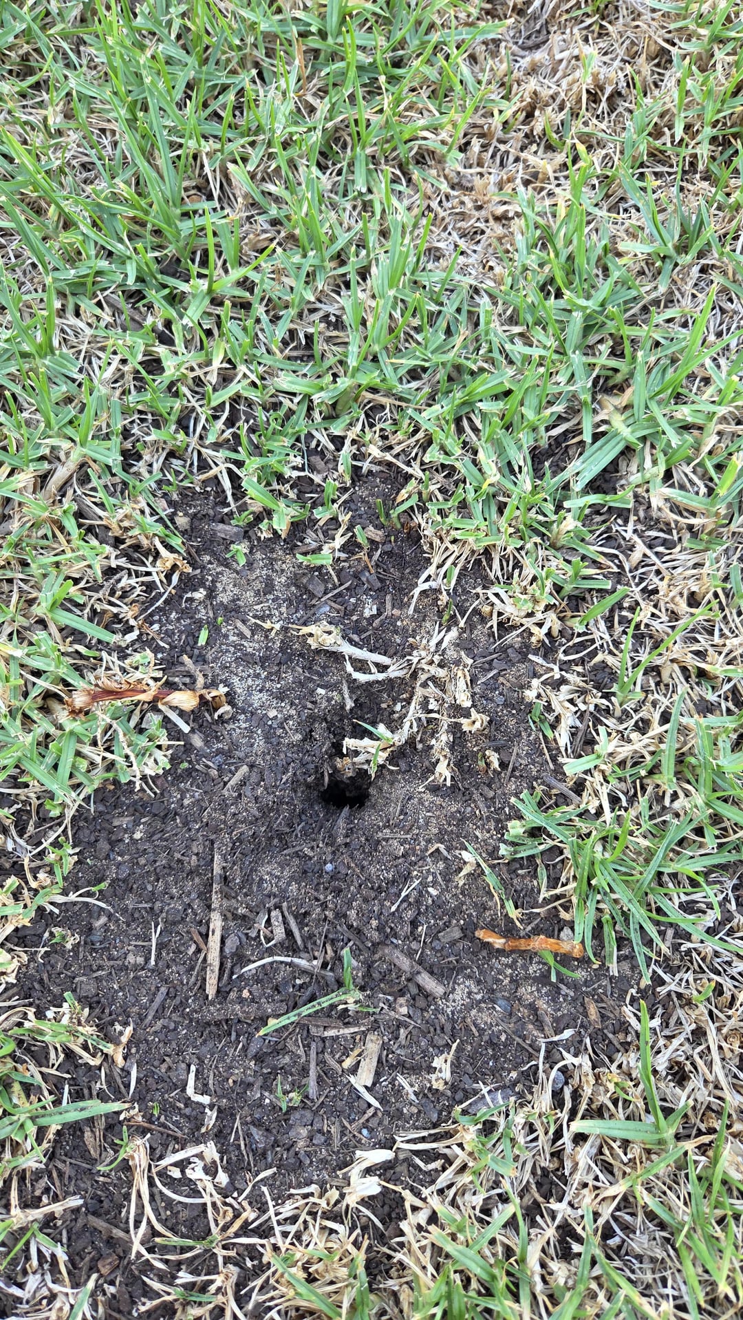 We came back from holiday about 3 months ago to find a 3-4cm (1-1.5inch) diameter hole in the lawn which was about 45cm deep. Thought it was lawn grubs so applied pesticide and refilled the hole only to find a new hole has begun to emerge in the same spot. First two photos are the original hole, last two are the new hole. Located in South Australia
