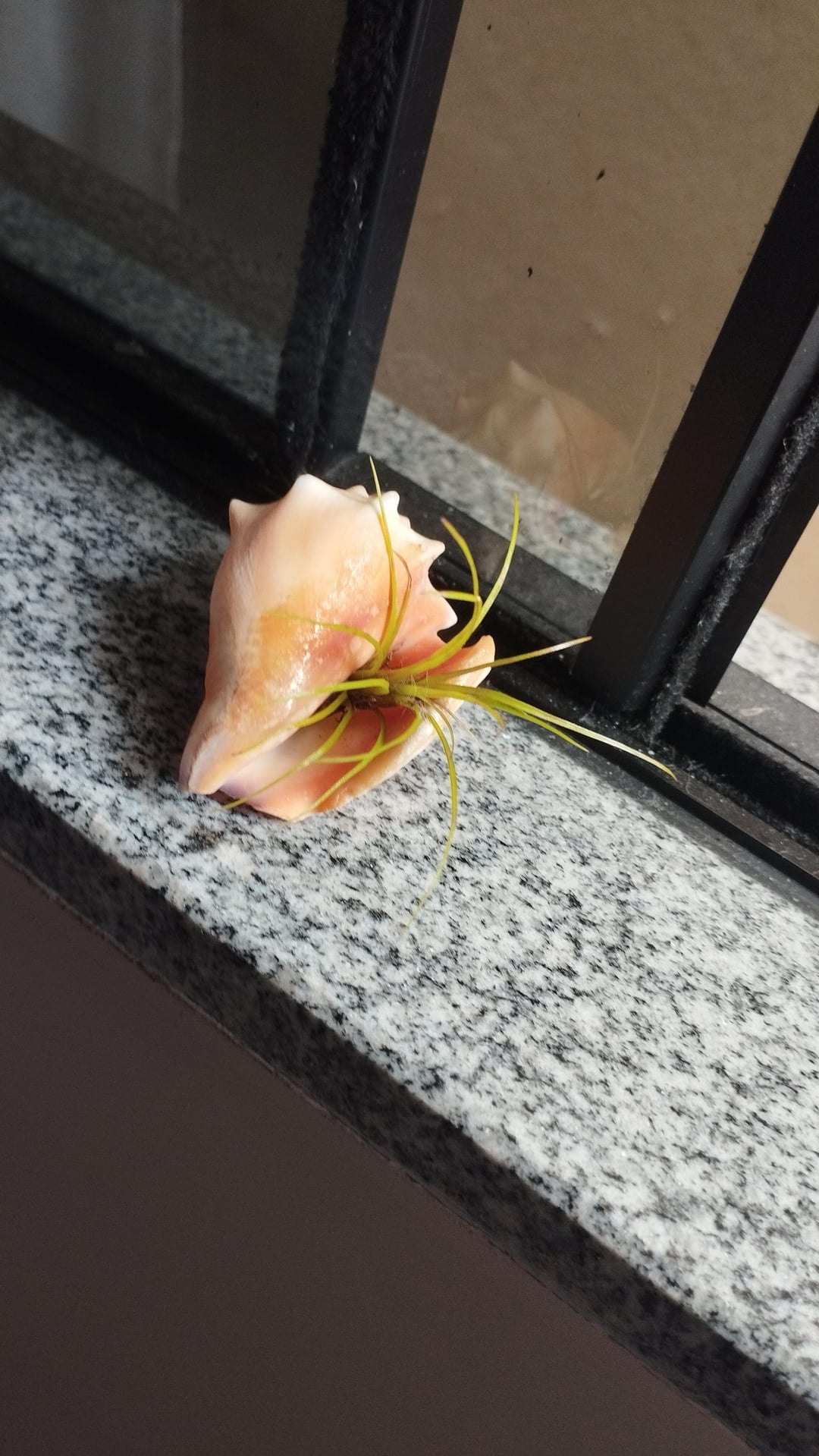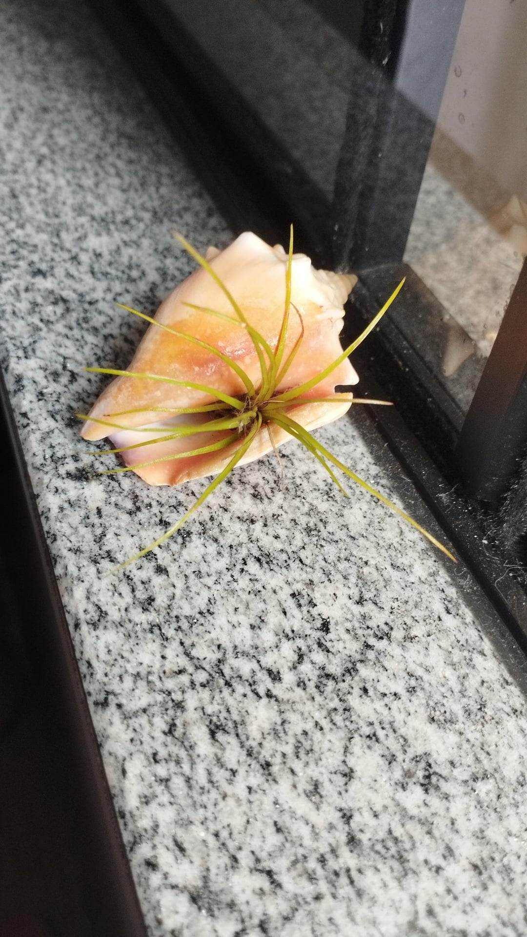 1. Perhaps let it sit over the opening of the shell rather than going into the shell. Tillandsia do better with good air flow which helps prevent rotting