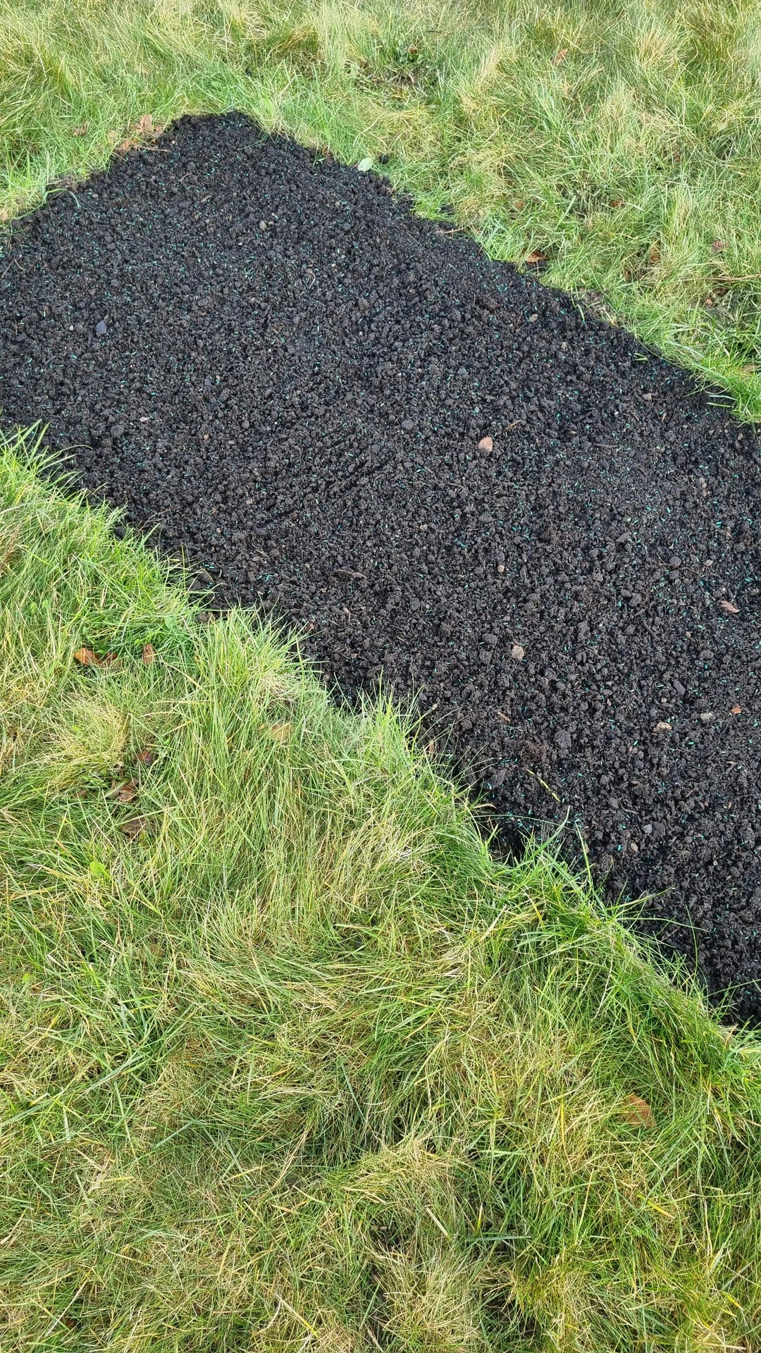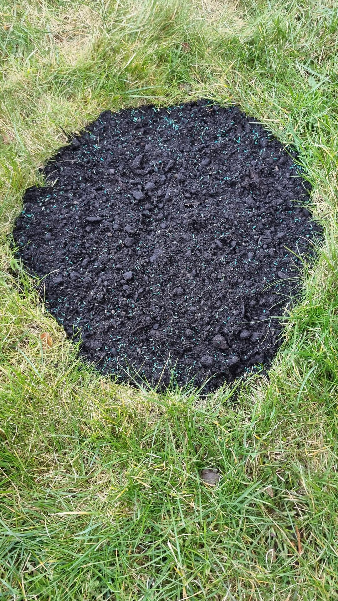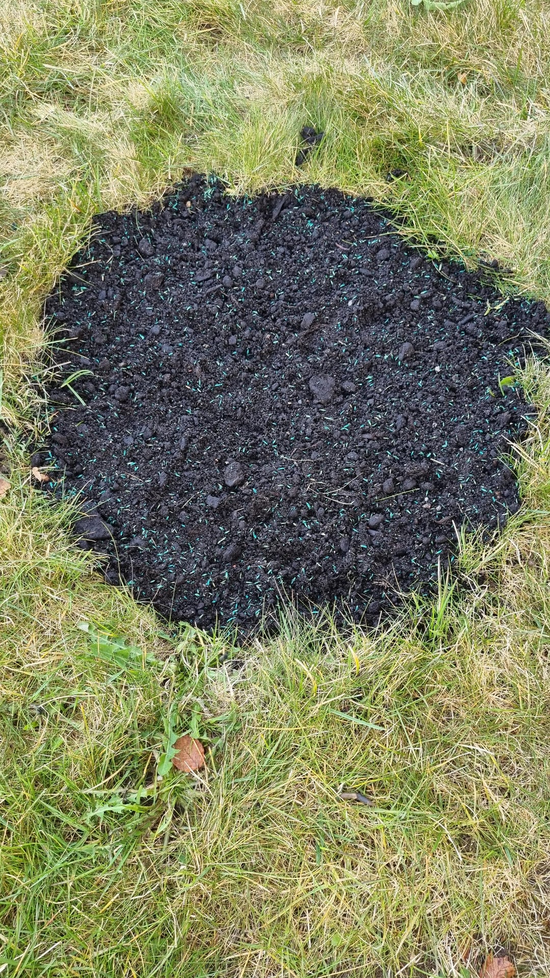 I have these areas on my lawn that I have overseeded. The process was: rake the soil (after having removed some raised garden beds), spread out topdressing, rake the topdressing, overseed, rake again, a little water. The result looks like this. I am worried that the clumpy soil/topdressing will affect the germination of the seeds. Also, I don't know if the seeds have good soil contact. I wasn't shy when overseeding so there should be as many seeds below the surface as above the surface. The work is from 4 days ago, and I have been gently watering the areas twice a day.