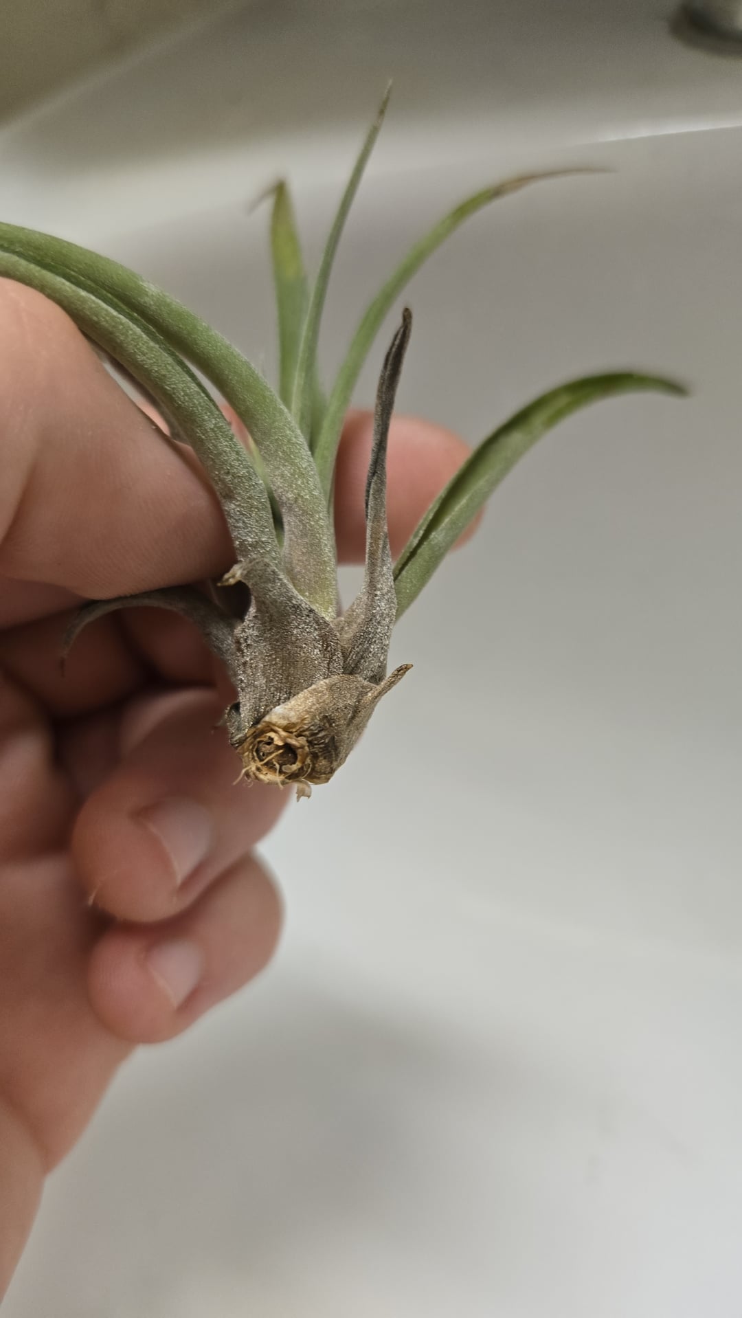 Im pretty new to airplants, and am learning as I go. I kept this plant in an egg carton so he would stay sitting up, the problem is I also sprayed him in the same spot. This meant that his base had almost no circulation and if I sprayed too much water it would pool a bit around his base.