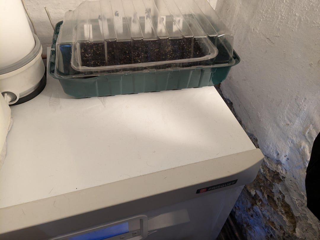 I put a cover over the container leaving a few gaps for air circulation and place it on my basement water heater. It get a steady and gentle heat of around 20-22°C. The seeds should germinate within 3 days.