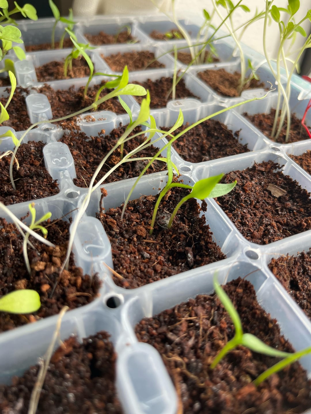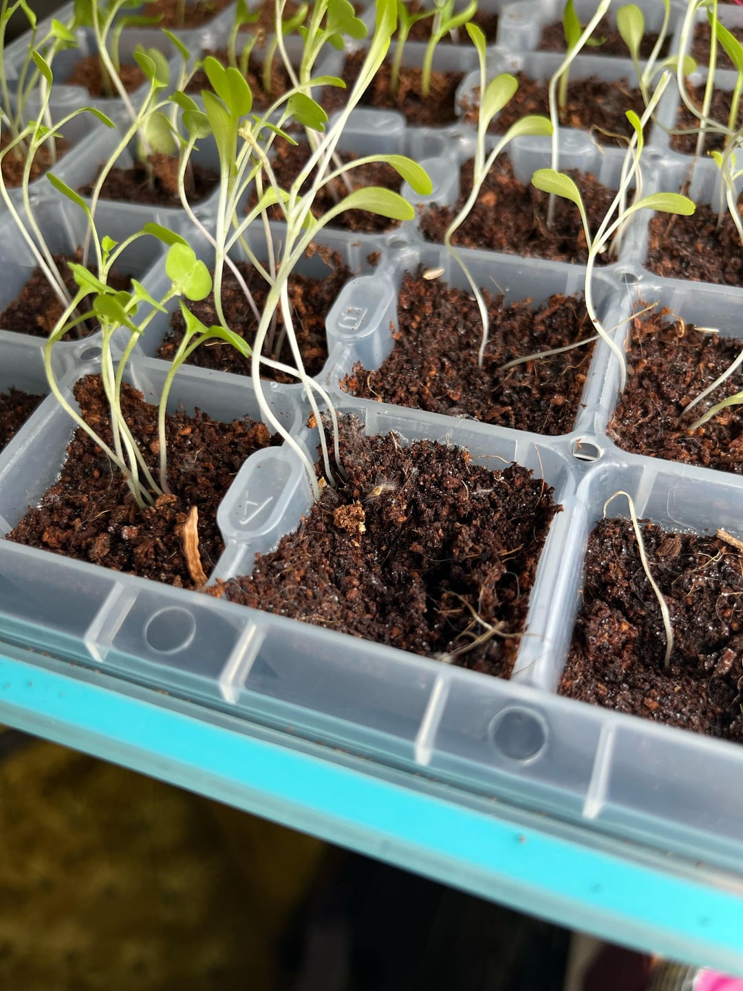 These look pretty leggy. They are reaching for more light! Veggies seedlings need full blazing outdoor sun for proper growth. Some achieve this indoors with a powerful grow light 2-3″ above the plant. Either raise the lights or lower the plants as they grow to maintain the 2-3″ distance from the light until they are ready to transplant.