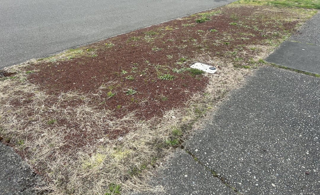 (Image shows a space between sidewalk and street full of pea gravel. One is an example of a weeded section and the other is an unweeded section, as well as close up of reddish pea gravel)