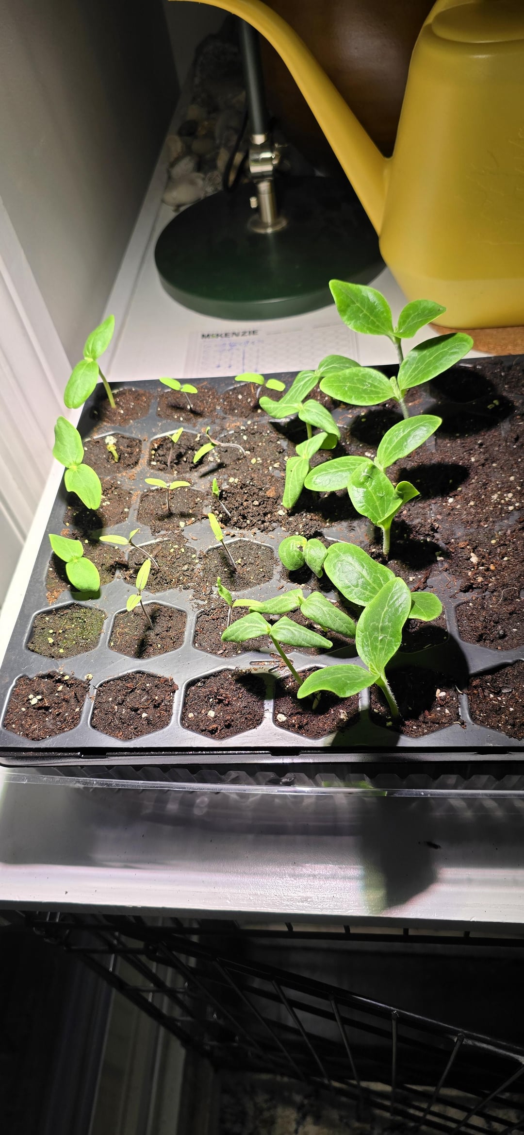 I think it’s just because the squash/cucumber seedlings are so big and deep green. It makes the tomatoes appear malnourished, in fact they look fine. Your seedlings have zero etiolation. They’re growing good.