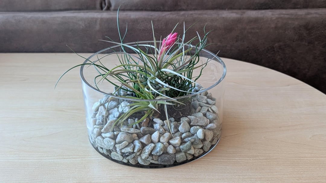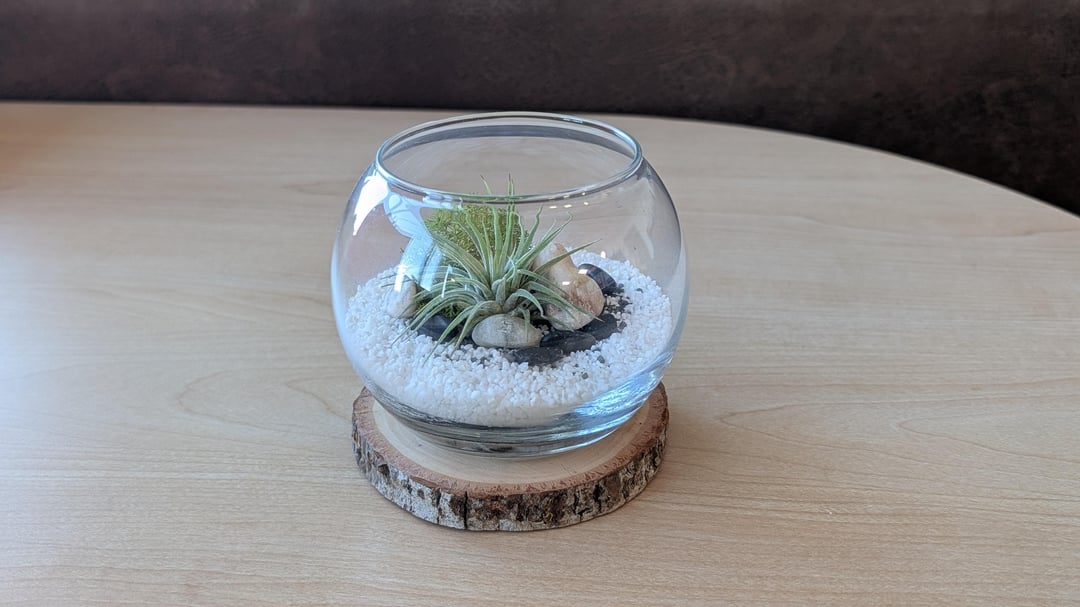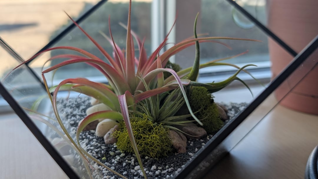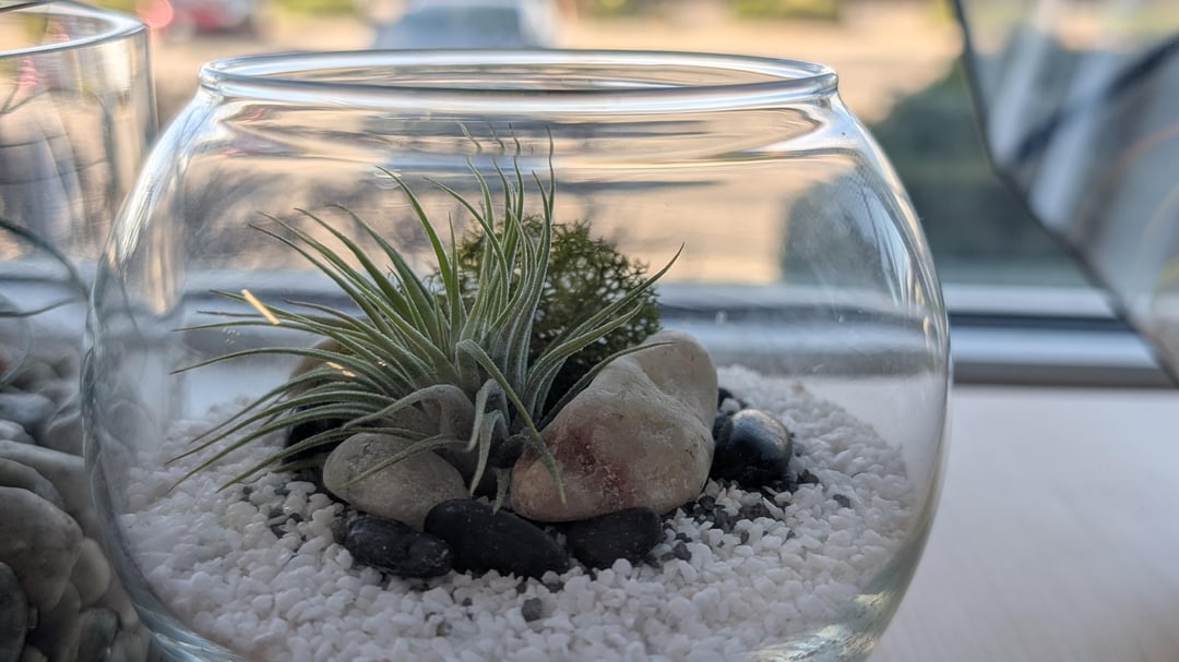 OP, I too like making mini terrariums! Because air plants don’t like stagnant air and react by turning into rotten mush, I recommend you switch to using fittonia if you can. They’re super easy to propagate, LOVE humidity, and come in a range of greens, pinks, reds, and whites! They would love this kind of set up and most big box stores carry at least one or two kinds of them.