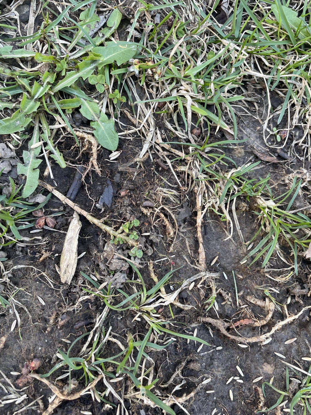 I’m not the biggest fan of white clover as a lawn alternative, and this area here is one example of why. I’m in Iowa (zone 5B), where we get freezing temps for most of the winter. When you combine that with shady conditions, a lot of the areas where clover is taking over in my lawn look like this in spring time. Those whiteish vine looking things are clover rhizomes, just now finally starting to wake up.