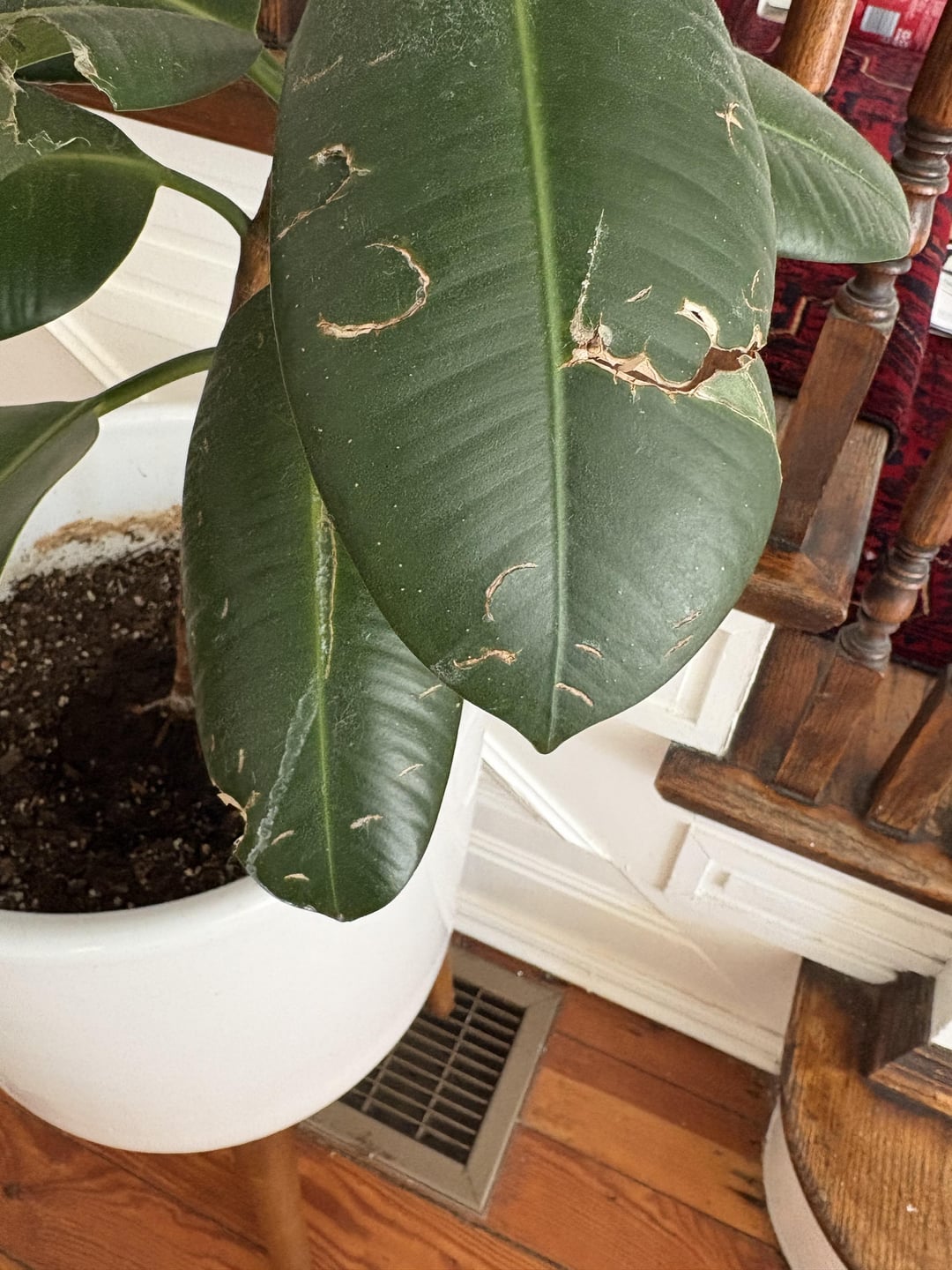 I dunno about the rips, but your pot is definitely an issue. It cannot drain excess water anywhere. You should have an inner nursery pot inside your decorative pot so one can drain into the other.