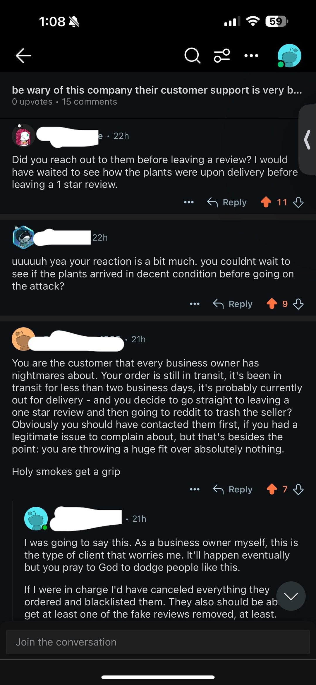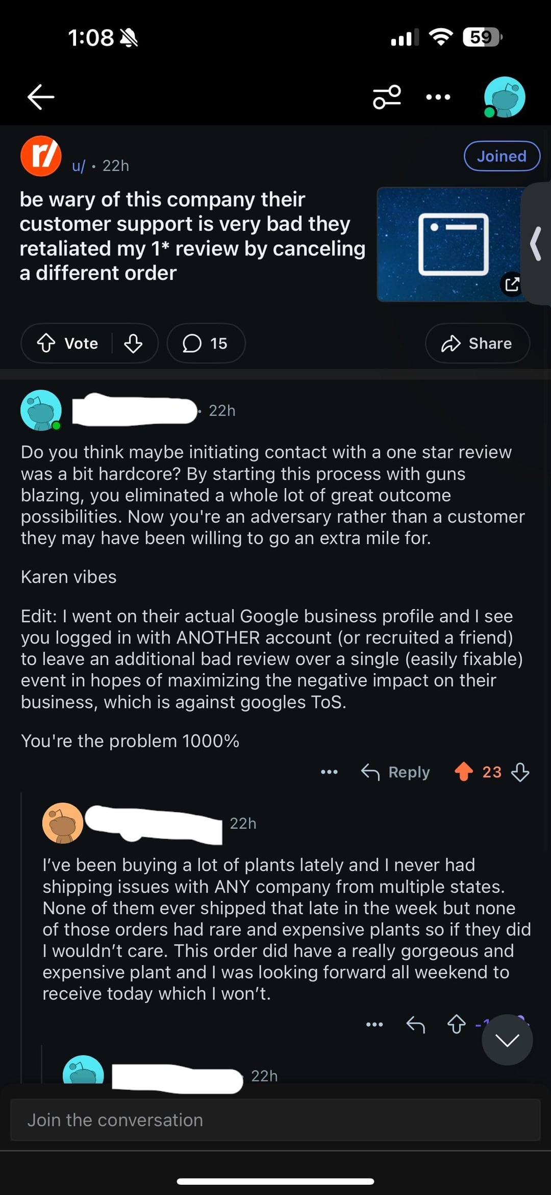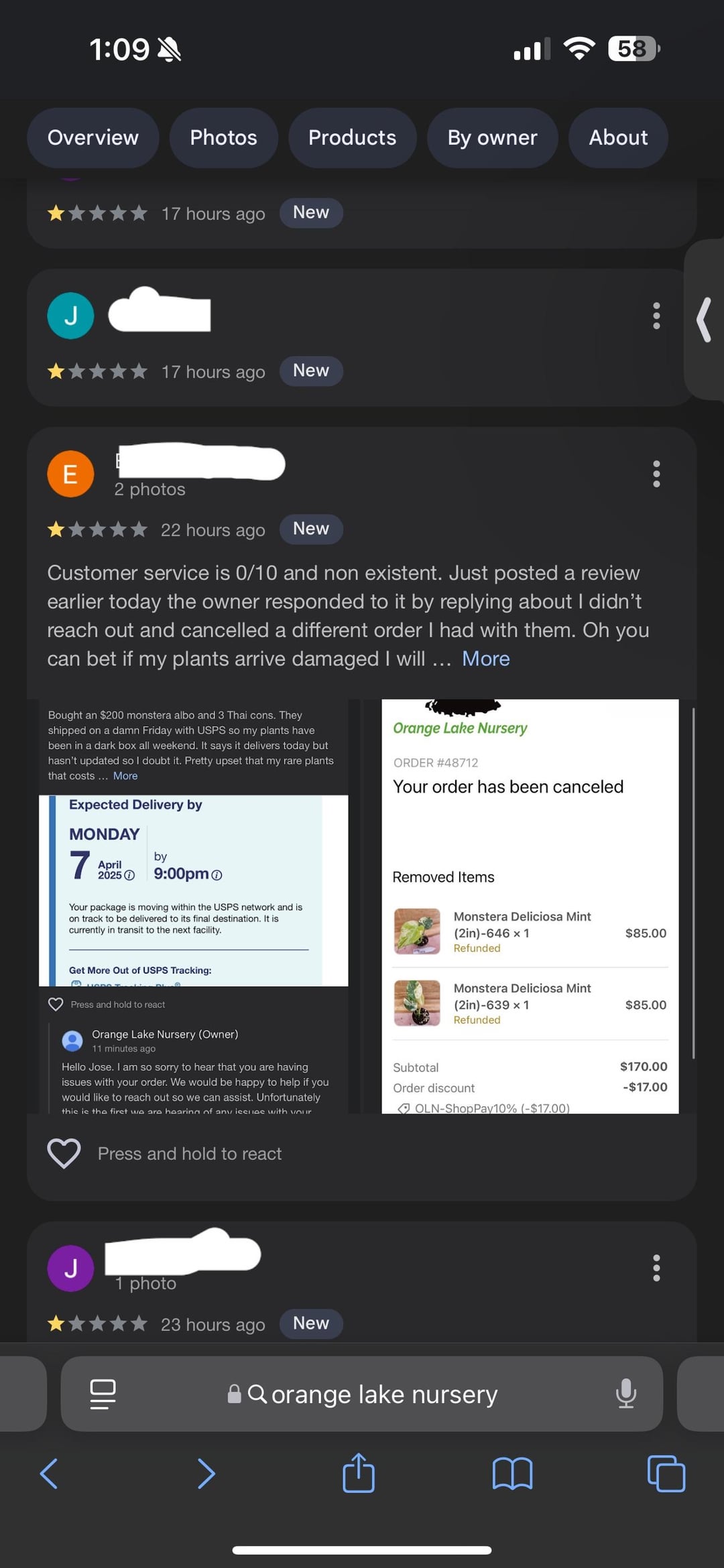 Essentially, their plants were still in shipping (for 2-3 days) and, without even attempting to contact company, blasts multiple fake bad reviews on their Google business profile in an attempt to hurt their business. All because they were concerned that there could be some negative effect on the plants, but plants were still in transit.