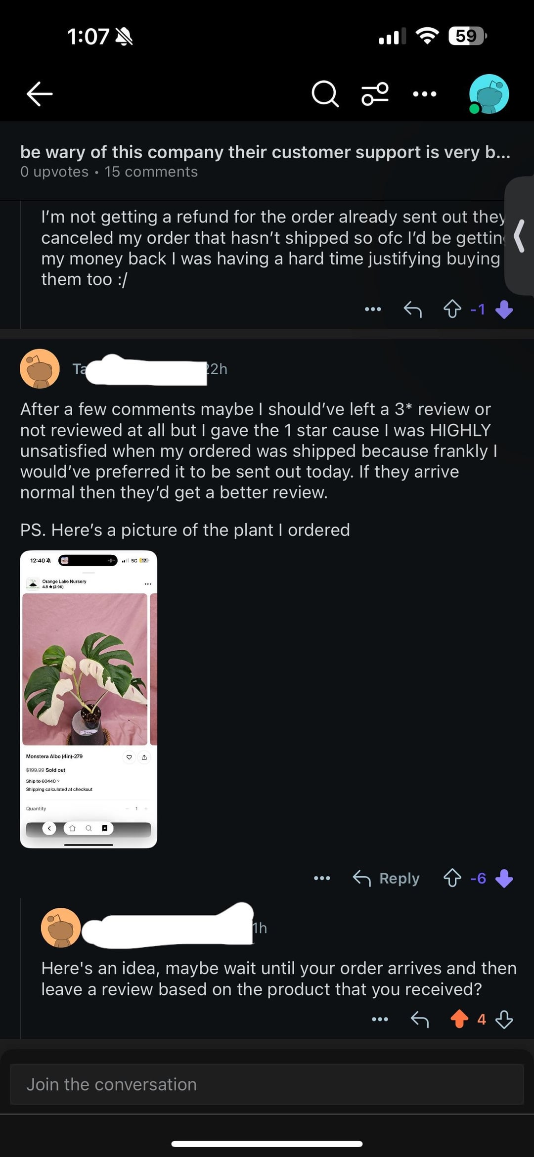 Yikesss. I mean sure shipping on a friday would annoy me too, but the person saying they should have waited for the plants is spot on. OLN packs plants great (i mean they ship rehab tc plantlets! The most delicate plants of them all!) and I’ve never heard anything bad about them.