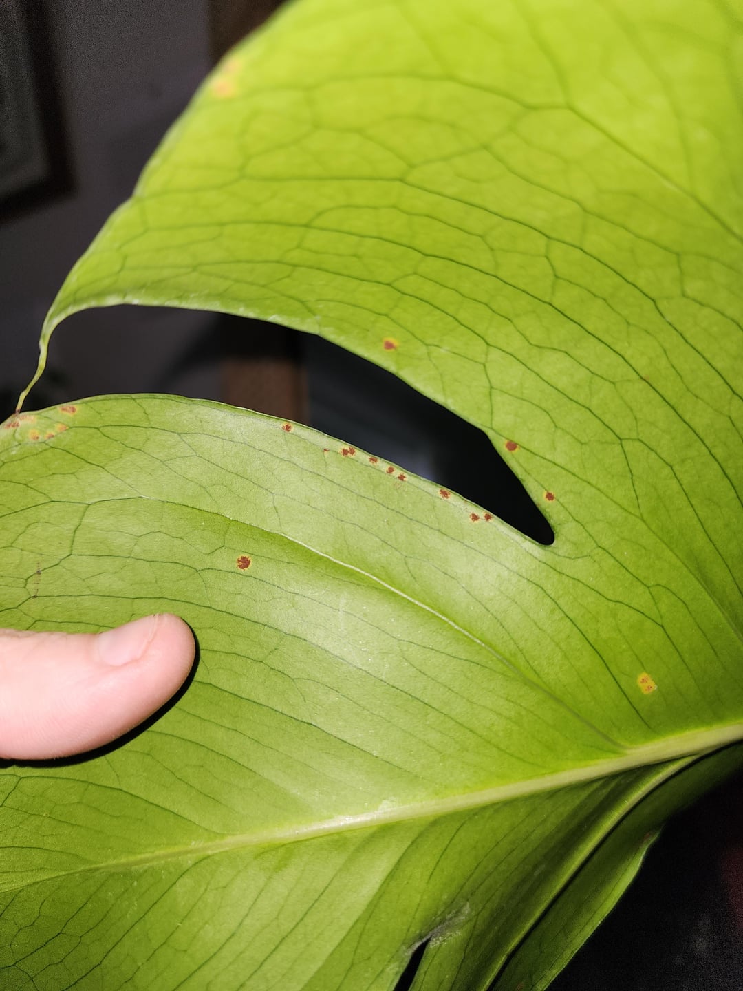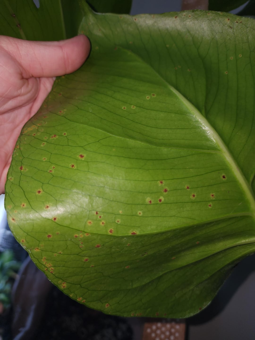 That looks like it could be rust or something in that area (fungal). I had some red spots on my leaves like that and they didn’t go away until I treated for a fungal issue.