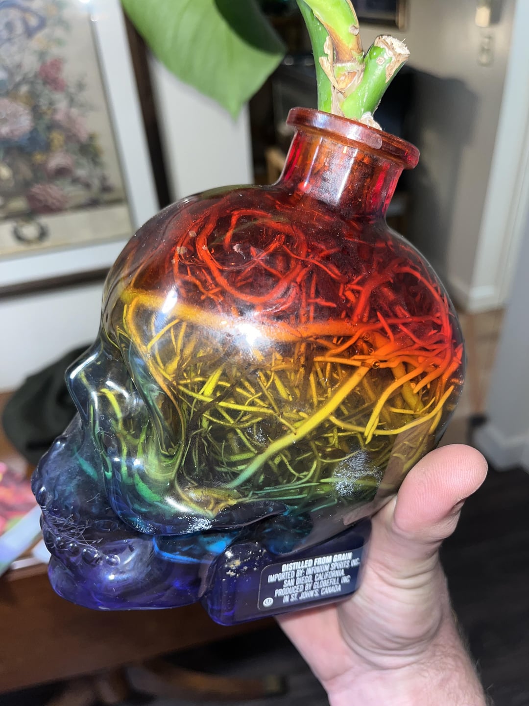 I’d drill a large hole in the bottom where the brain stem sits and then plant this on a prepared Halloween skeleton. Let the roots grow out that hole and start producing leaves across the skeleton. Would be such a cool decoration especially around Halloween.