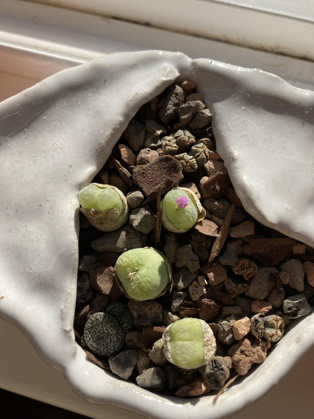 There are two types of conophytum in this dish, the camouflage ones don’t seem to change appearance much but the larger ones were grass green colored and one day they went pink. They were watered about every 2-4 weeks through the winter and only slightly soft now. Substraight is a mixture of angular sand and lithops mix (very coarse mix. Pot is glazed but I drilled holes in the bottom so it drains well. Lives on sunny window sill, was getting 4-6 hrs of sun all winter and now probably 7-8 hours. Are these just going dormant for the summer or getting too stressed? should I move them to a less sunny spot?