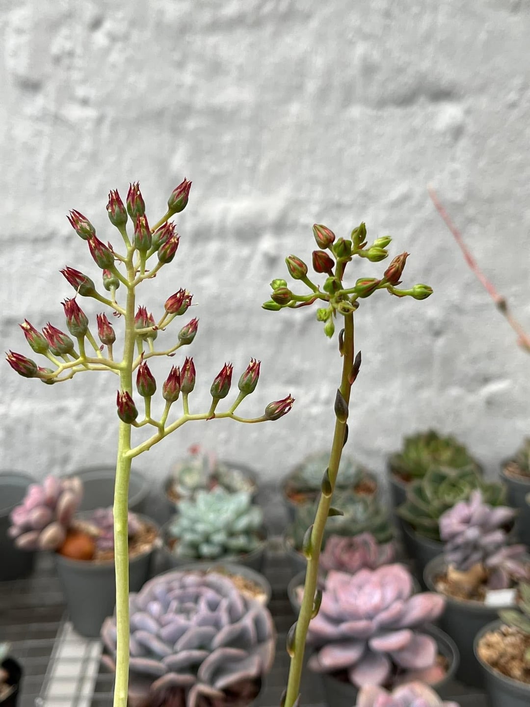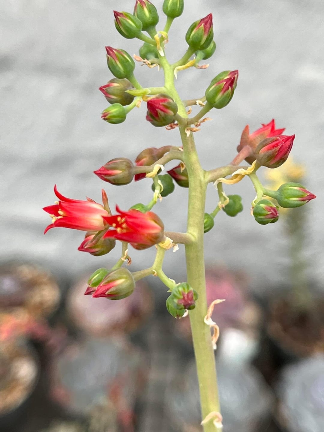 Echeveria affinis (the more common black species, often trading as Black Knight) was named after this plant, as in having an “affinity to” craigiana. Their flowers are very similar. The only prominent difference I can see is that craigiana has a distinct central exis that is not present in affinis. Third photo shows craigiana v affinis structure. Craigiana flowers already dried out, and affinis flowers yet to ripen.