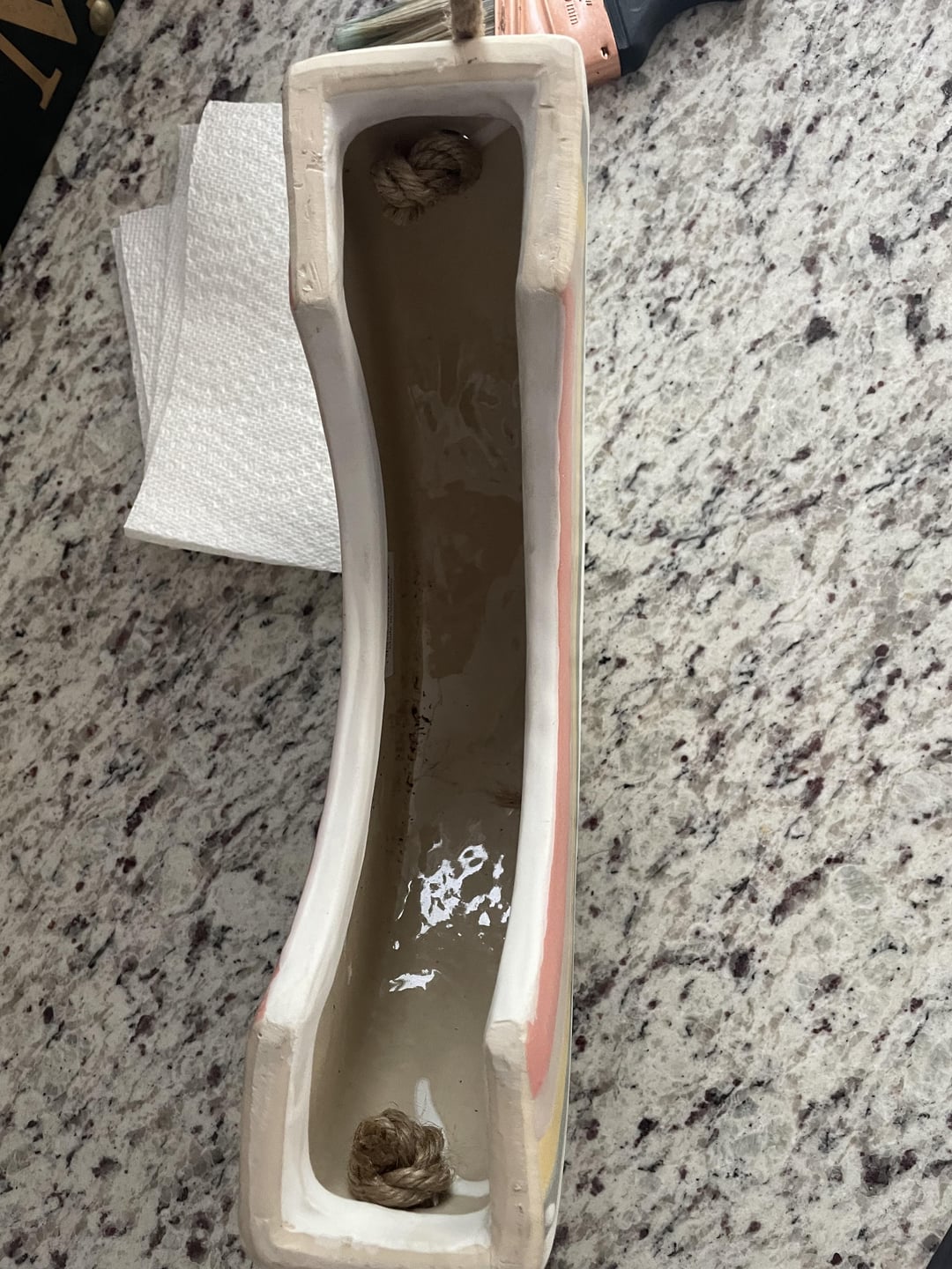 I filled a similarly odd shaped pot using small (small!!) nursery pots kind of folded so they were more oval shaped and put some pea gravel or foam chips in the bottom of the ceramic part so the pots aren’t sitting in any excess water. I put a slow growing hoya in it and it’s been very happy for years now. I can take the pot down and tip it to one side (holding the plants in with my other hand) to drain off any excess water, but I make sure not to over water too.