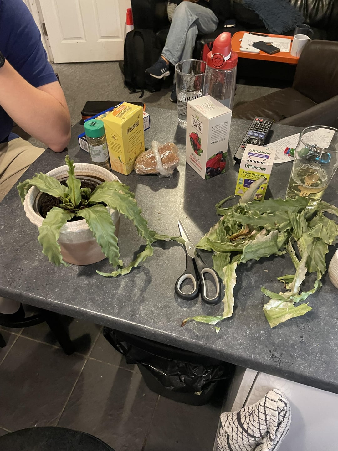 So I went away for a month and left my plant out to be watered by my housemates. I came back last night and it looked terrible. I only bought the plant 6 months and ago and it's my first ever plant. One of my housemates emptied the water sitting at the bottom of the pot and my French housemate said that if we cut off any unhealthy leaves, we can save it. It now looks like that… I panicked and probably took off more than I should have according to my French housemate.