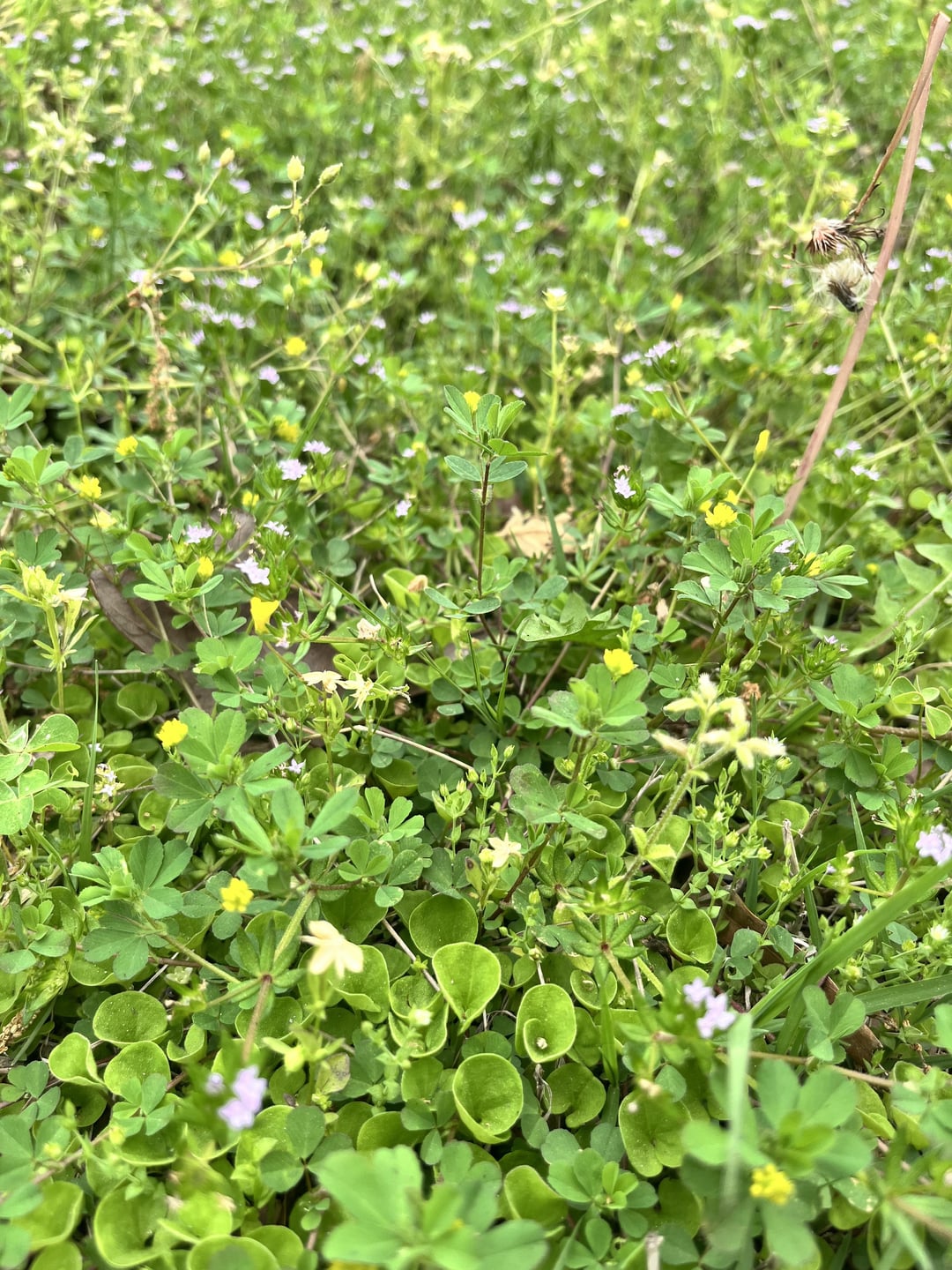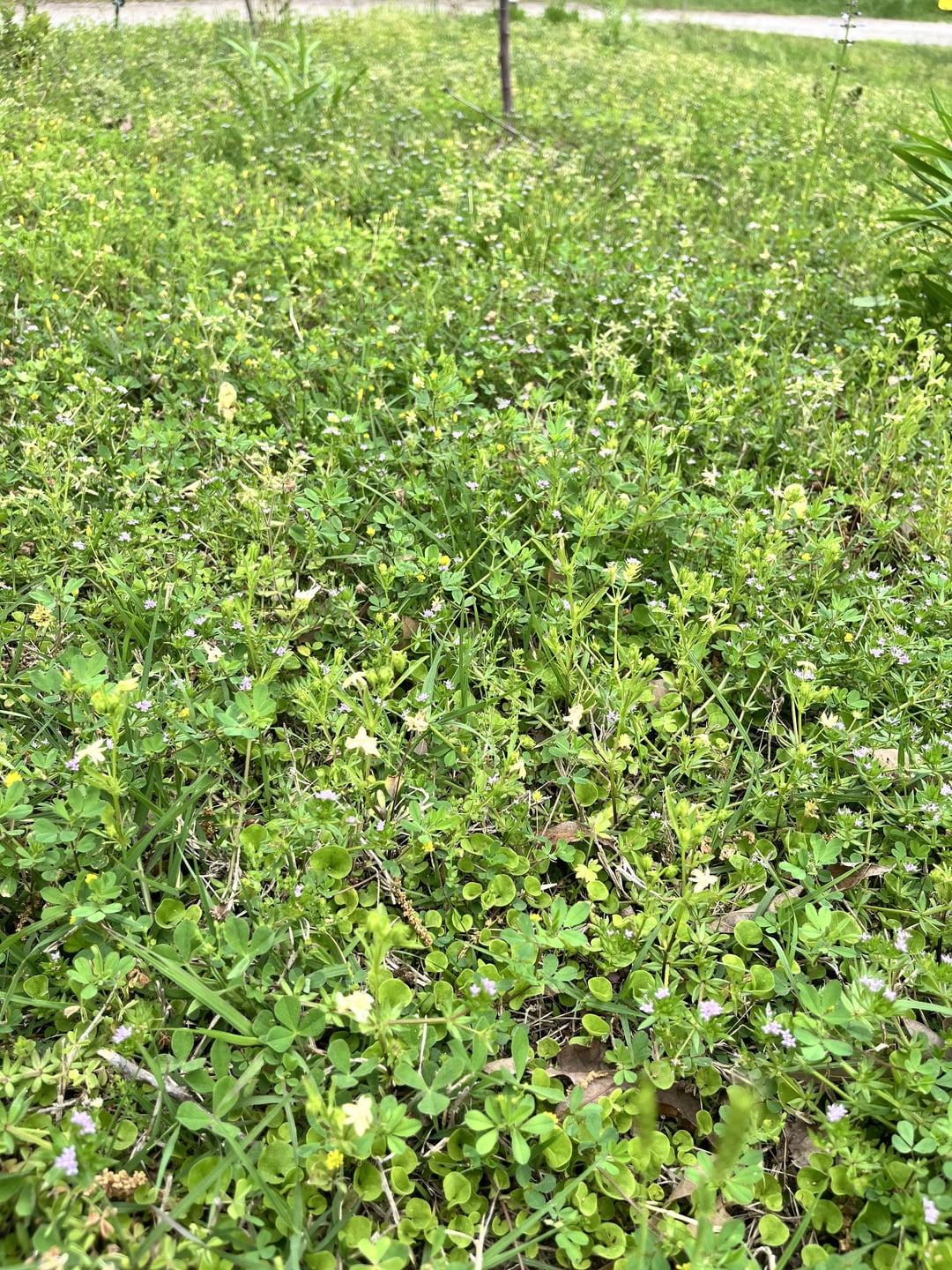 The yellow flower clover looks like black medic, which is an invasive weed here in the states. It will start to choke everything else out. I had to pull out a lot of it off a hill I am restoring to native plants and some it the roots where tree like in size.