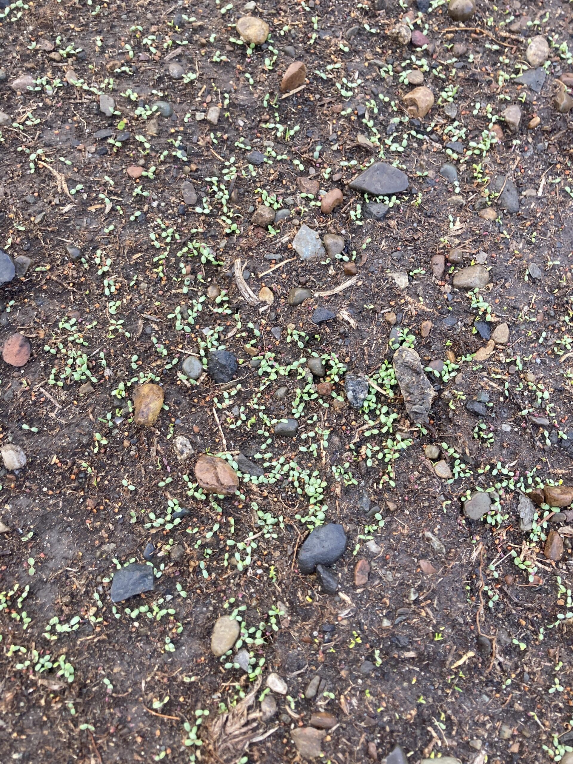 Covered our old dead grass in cardboard for an entire year. Pulled it up this spring, got rid of the top layer of dead stuff, put in a couple hardscapes, raked everything smooth and even, and seeded 5lbs of micro clover. This has been coming up a week after seeding and it’s all I can think about! So excited to see it (hopefully) fill in this summer 🍀