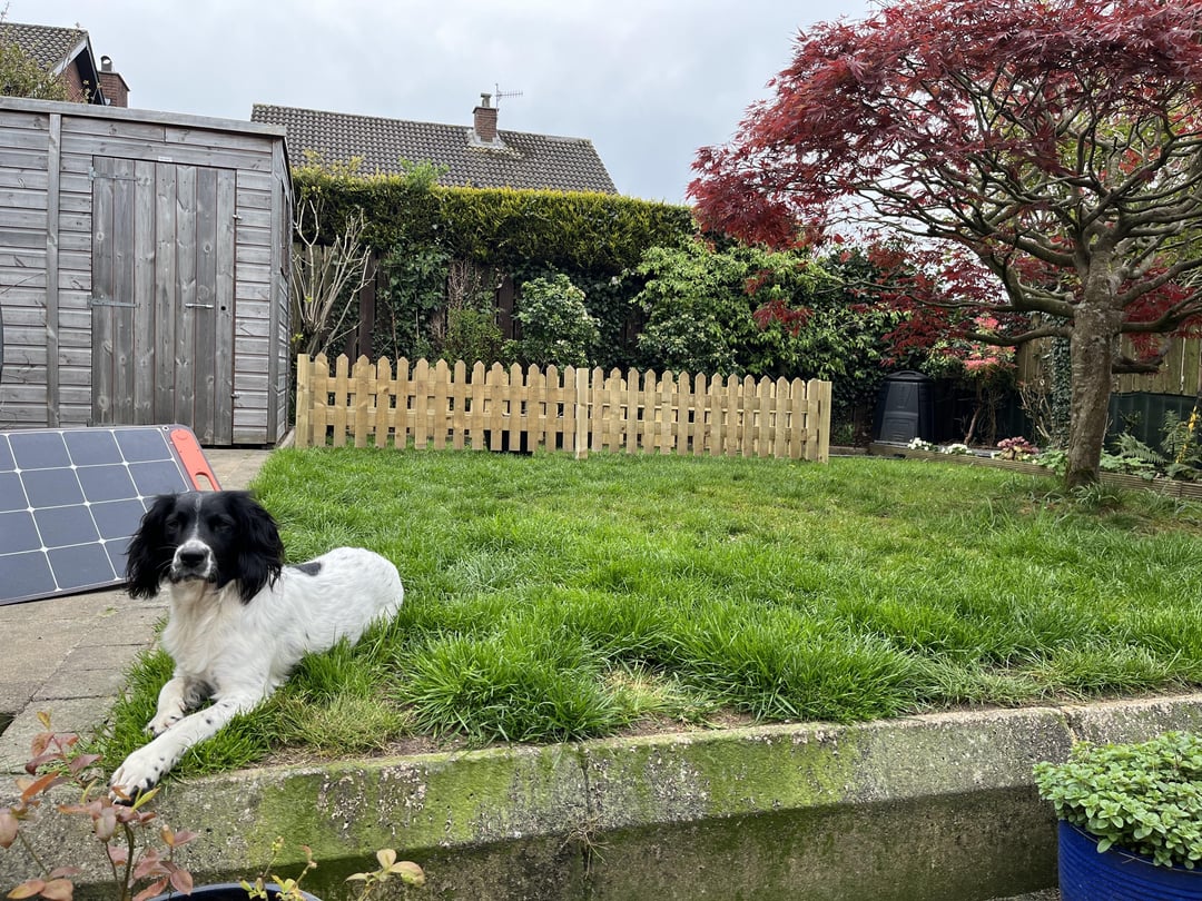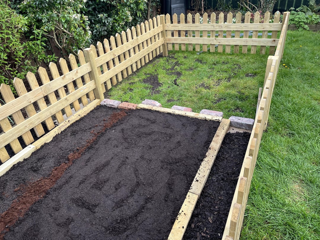 Project over the last few weekends: Wanted a veg plot and a spot for the greenhouse without taking up too much space. Just went full no dig and laid cardboard on top of the grass, will remove the edges once the beds have settled in a bit. Reason for the fence at the end.
