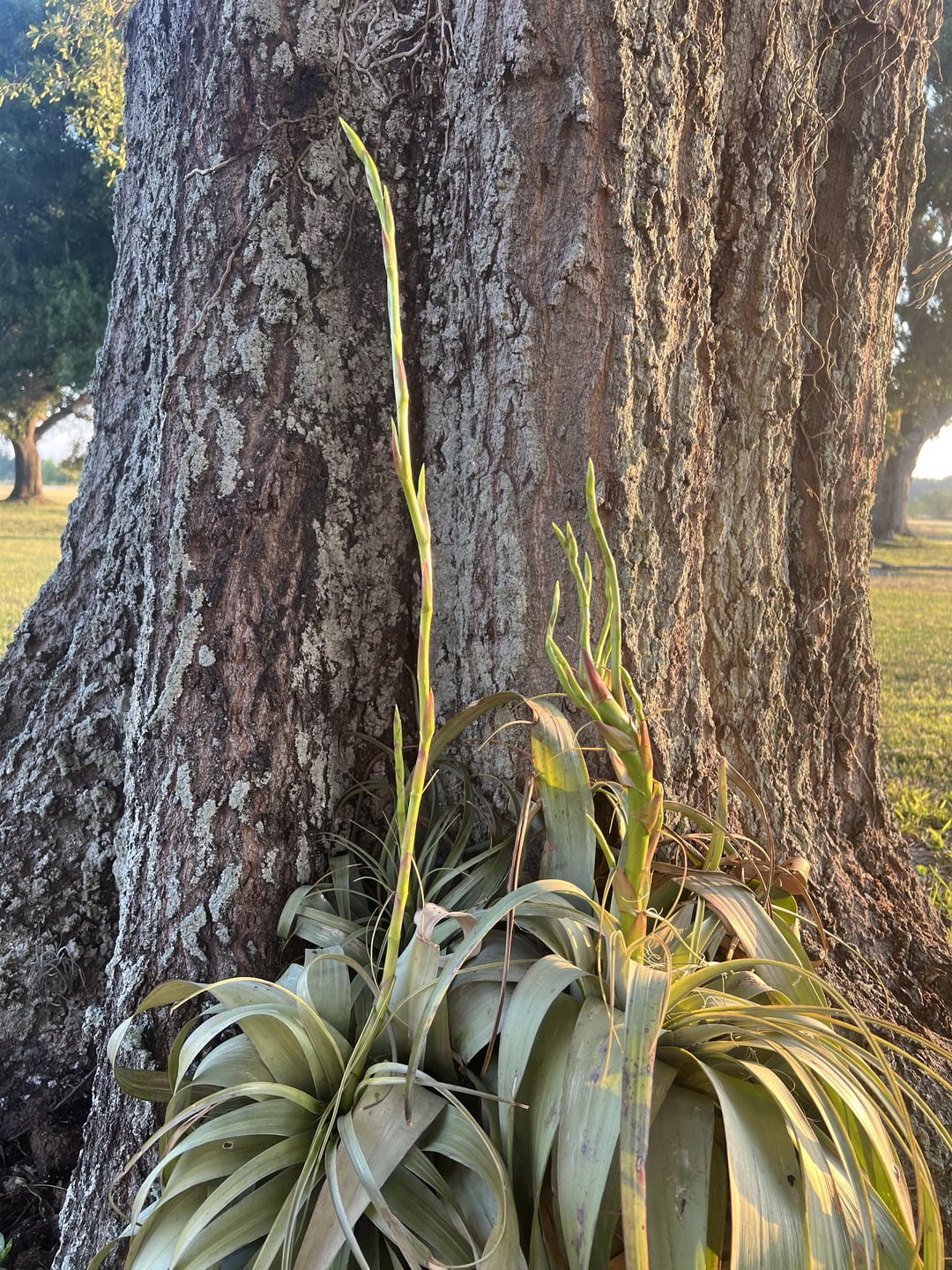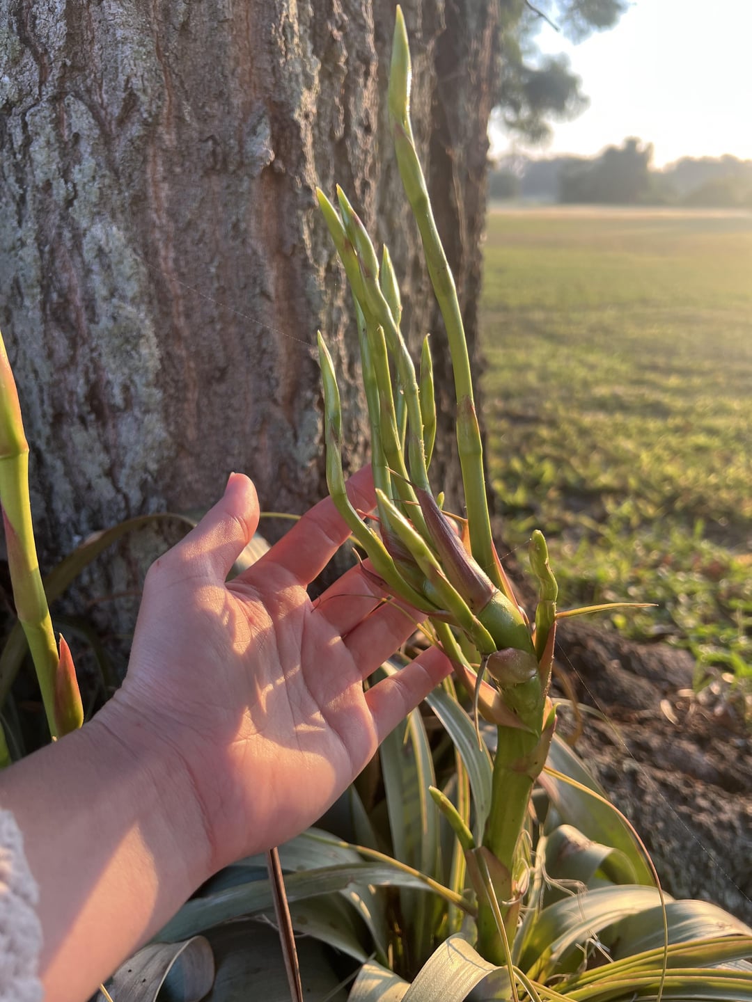 These fell during a hurricane and I couldn’t ever get them to stay up in the tree, so they grabbed onto the tree base. They’re blooming I think – but one looks so strange! It is much thicker than the other and has split into a bunch of fingers.