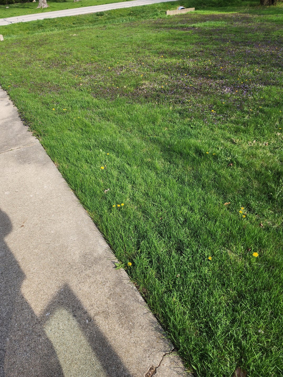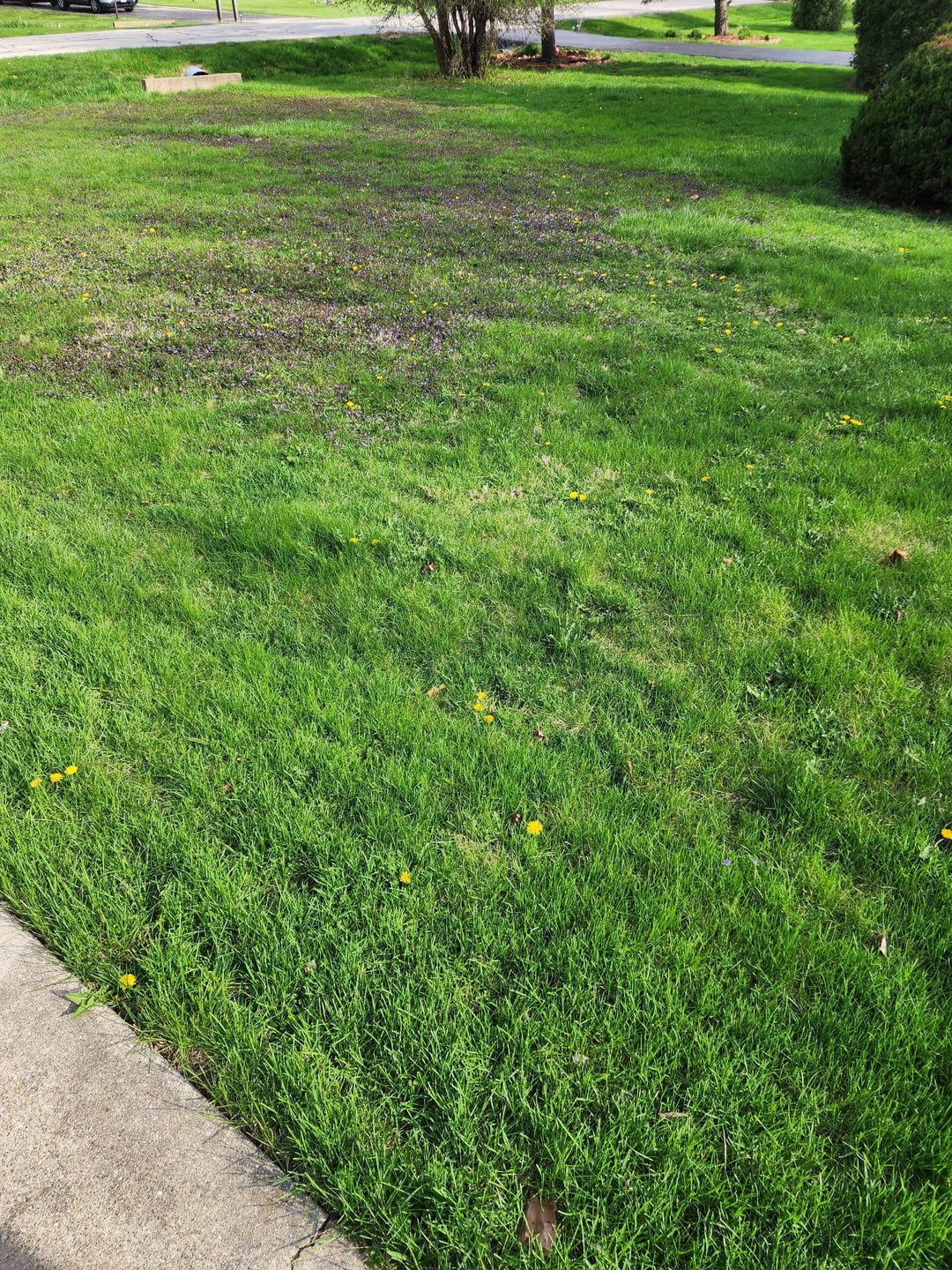 Your lawn is in pretty good shape, helped a long by the good rains we had in IL the past few weeks. The purple blooms are creeping Charlie – hit it 2x with an herbicide like Speedzone or even Ortho CCO two weeks apart. Creeping Charlie spreads quickly but now when it’s blooming is a great time to spray it – when it’s blooming it’ll be more susceptible to chems.