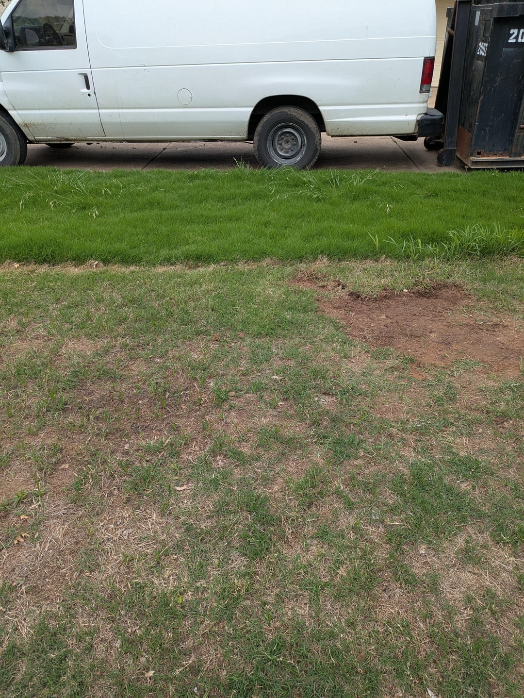 What could be causing my neighbors grass to grow so we'll, I never see him water or do anything, you can see the weeds/crabgrass in his yard. My yard I've only just started to control it was 80% weed before. So I don't expect to be looking nice yet. But I kinda wanted to know if a I should actively be de that hing the killed weeds on my side and b if maybe I should try and just lay down sod of Bermuda since it appears to grow quite well, or if I should just seed with a mix of Bermuda and maybe fescue? This is in North Texas Fyi. Also not sure it's alright or not but you can see on the right where I started digging up well established crab grass from before. Just looking for some guidance!