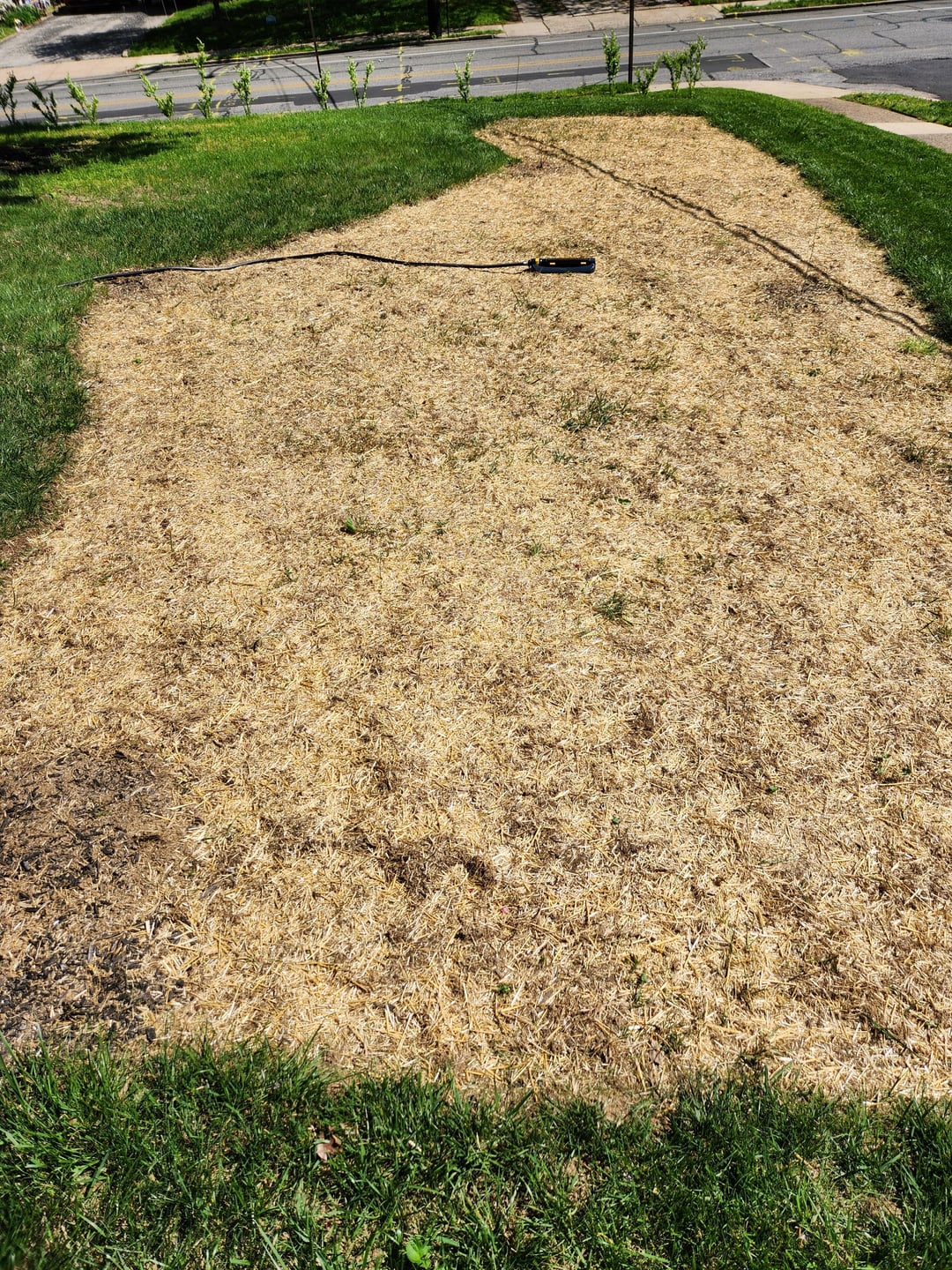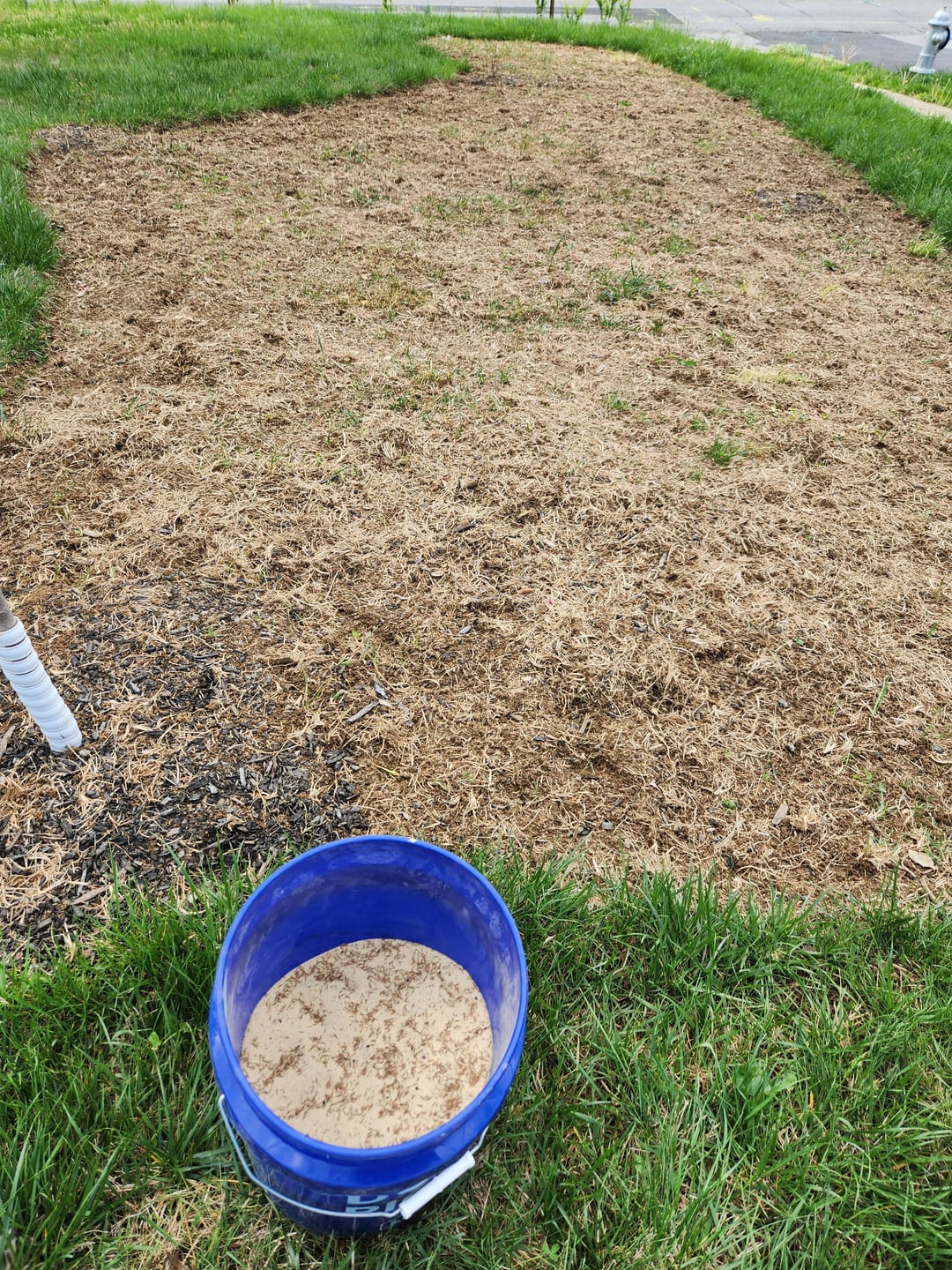 Seeded and covered with straw, now for some patience! Still having some grass poke up, but I'll keep any survivors <8 inches to let the seeds get the light they need. I did apply glyphosate a week before, I think it's still working through the existing greenery.