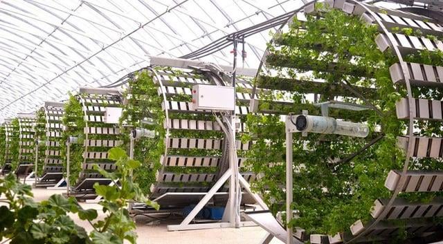 it doesn’t look viable. I’ve been growing salad in the ground for 15 years and that isn’t a lot of weight of leaf lettuce compared to the infrastructure cost. All those circles do is extend the capacity that the grenhouse can hold, but as you can see clearly there are trophs with bad germination or disease, and the cost of greenhouses vs olperating a light and having a motor constantly rotating giant custom fabricated machines is not a cost effective venture.