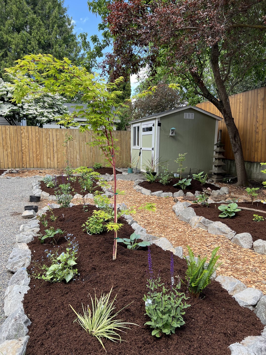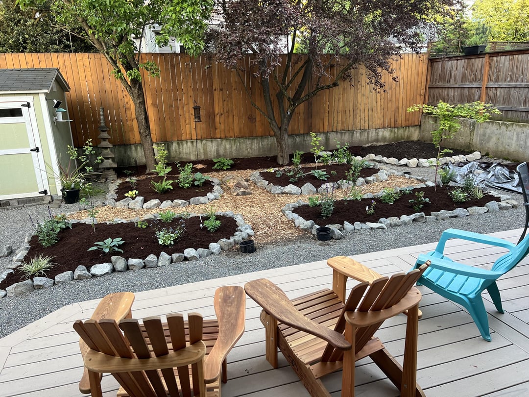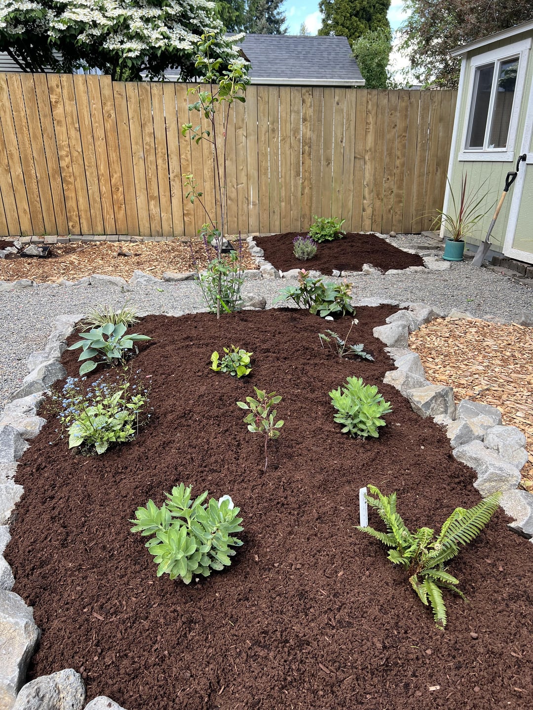 I chose a mix of ornamental and PNW natives, with plans to add more natives in the fall, and raised beds for veggies next year.