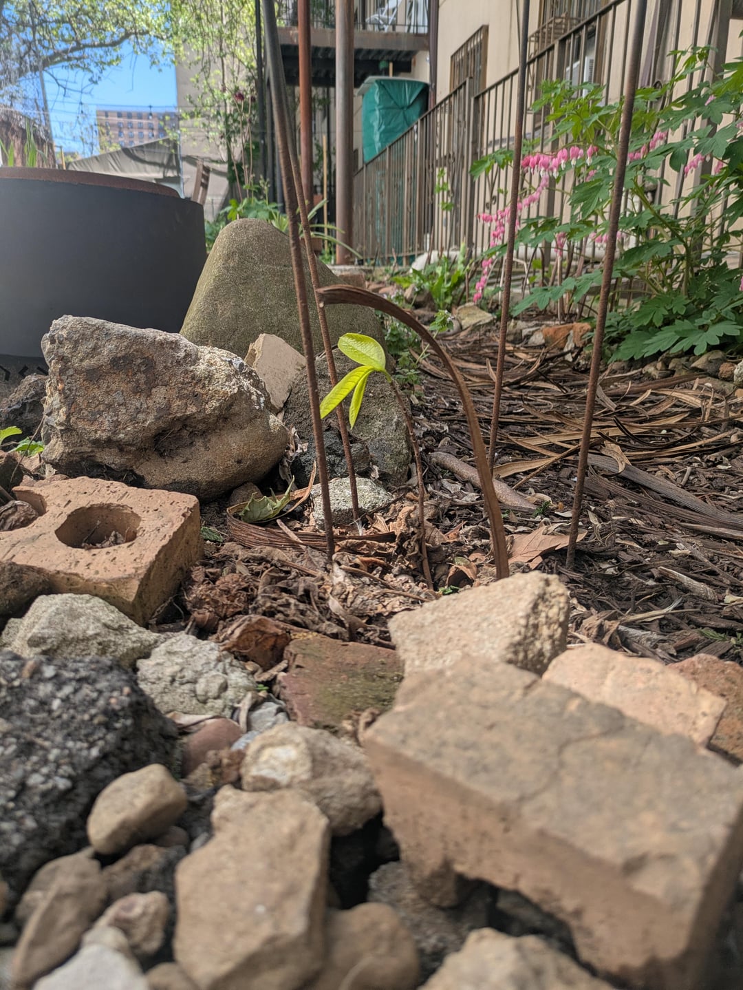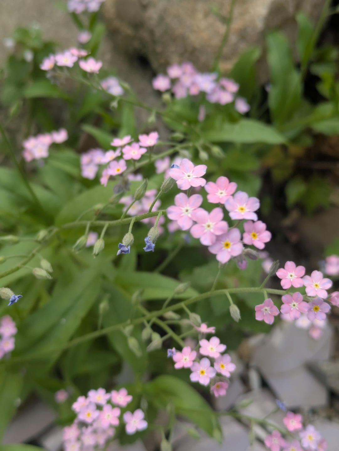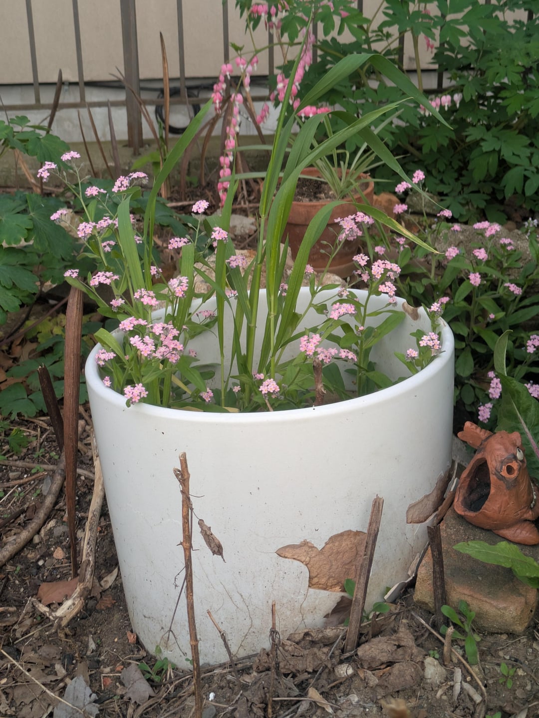 2 reseeded forget-me-not, barley, and a bleeding heart in the back