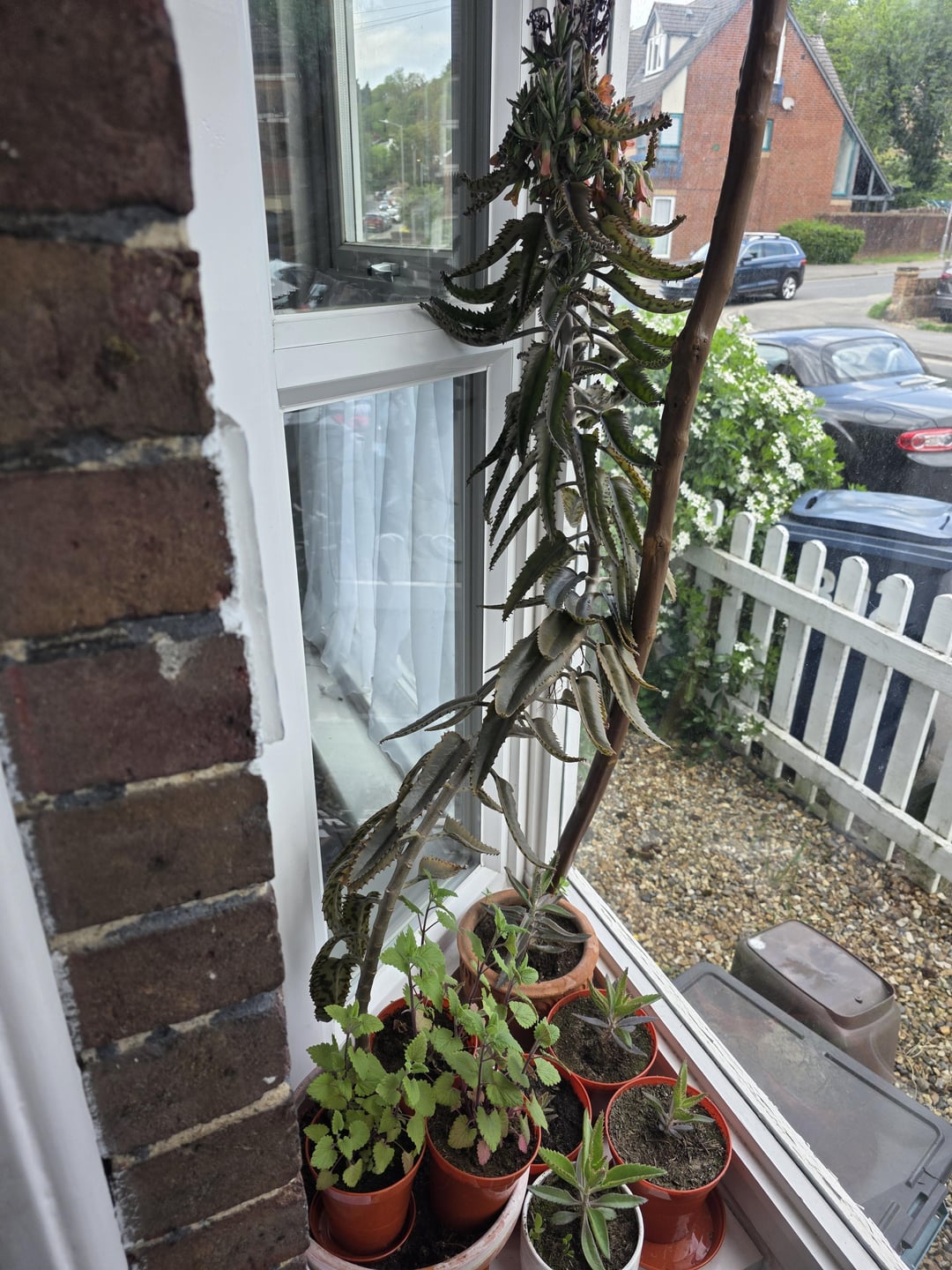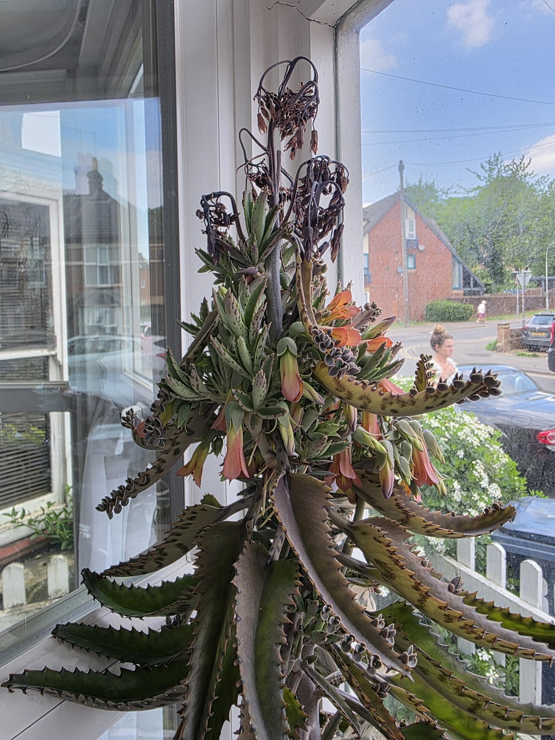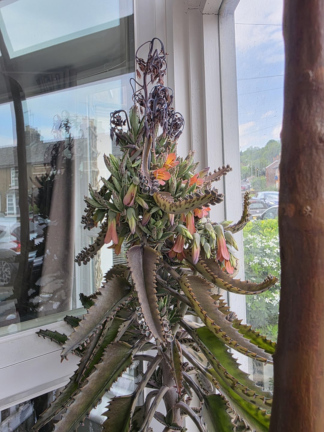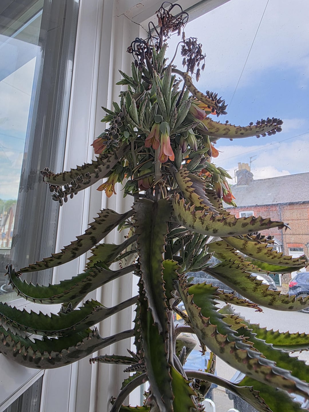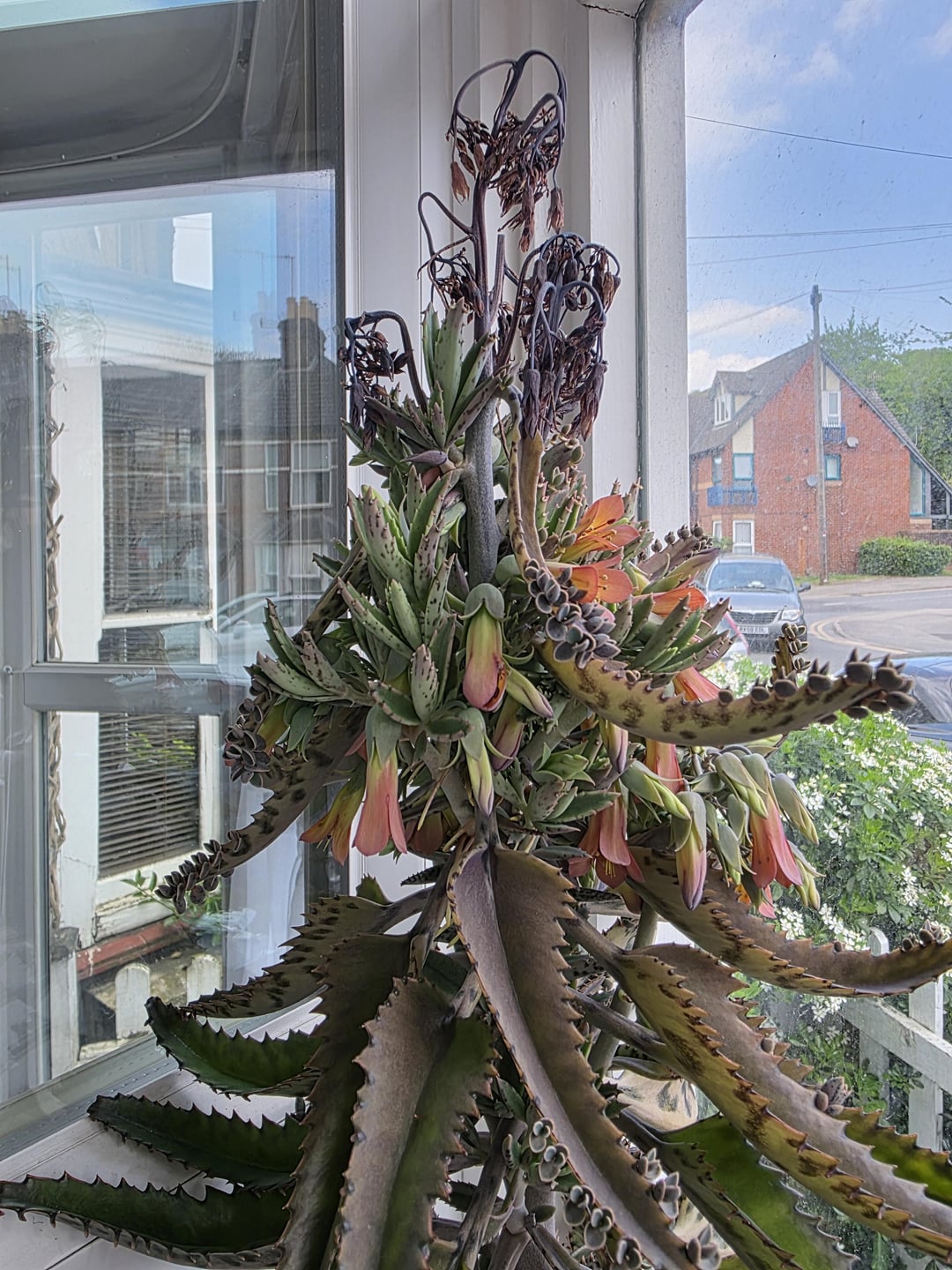My wife was gifted this 6-8 years ago when it was only a few inches tall. Flowering for the first time. Dead growth on top is where it tried a few weeks ago and failed.