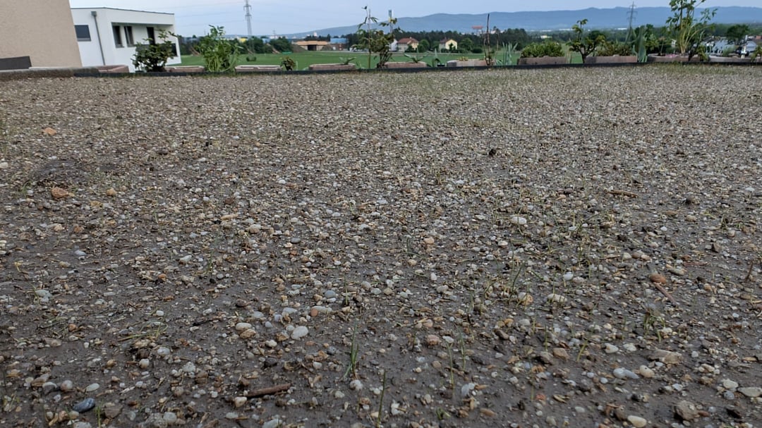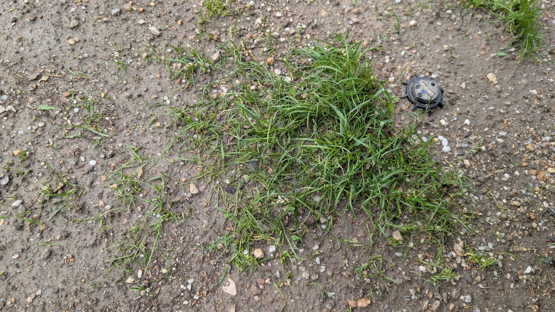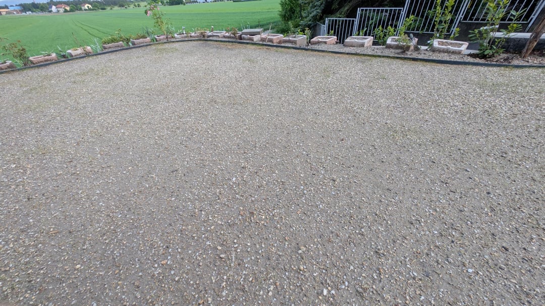 All I see is some form of aggregate/gravel. Not proper ground or even bagged (which wouldn’t be ideal) top soil with a mixture of sand potentially