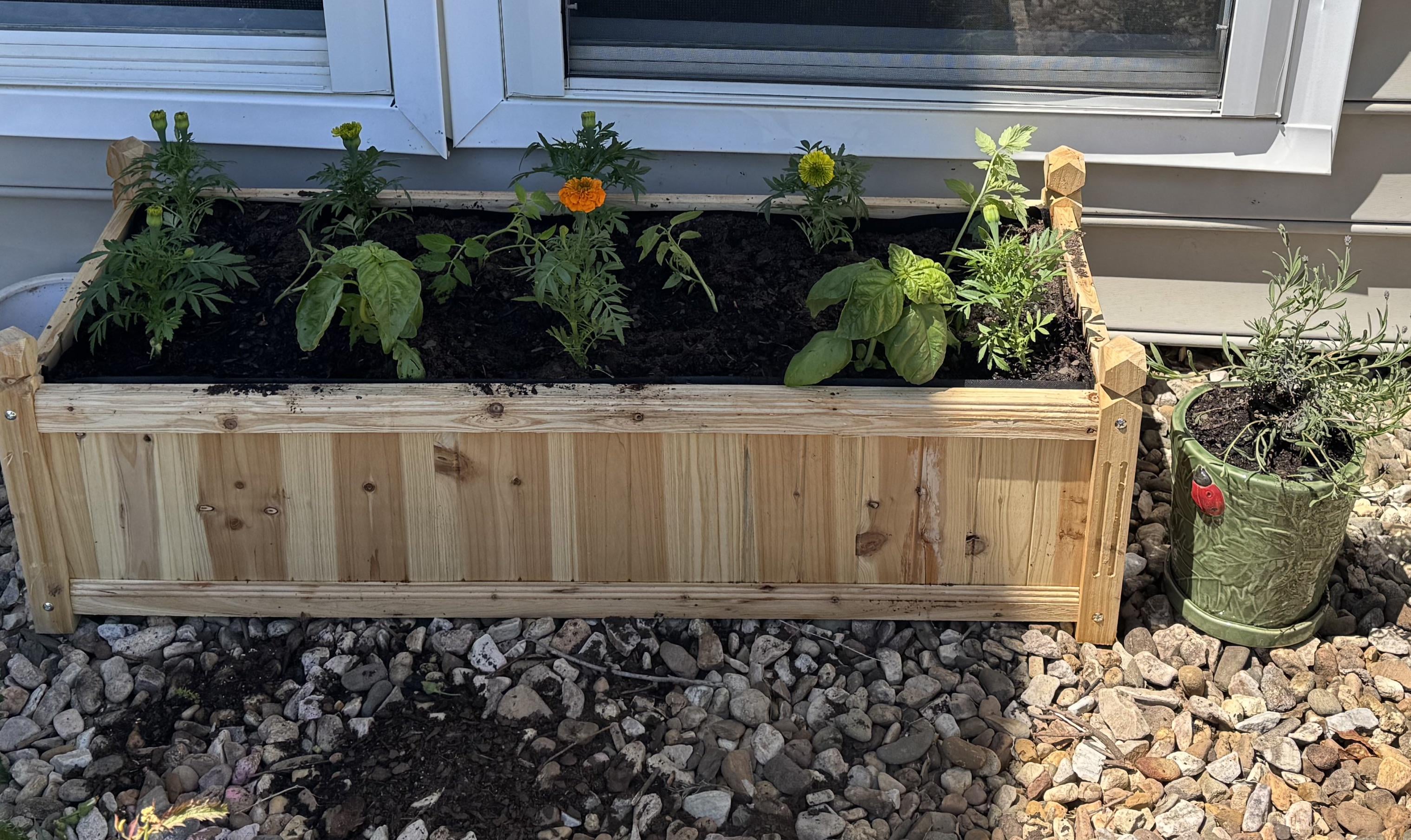 going to get some stakes for the tomatoes today too! my package was supposed to come with a second bed the same size where i’d put 2 strawberries, some bee balm, 2 rosemary, and more marigolds… for now i guess i have to wait 😭