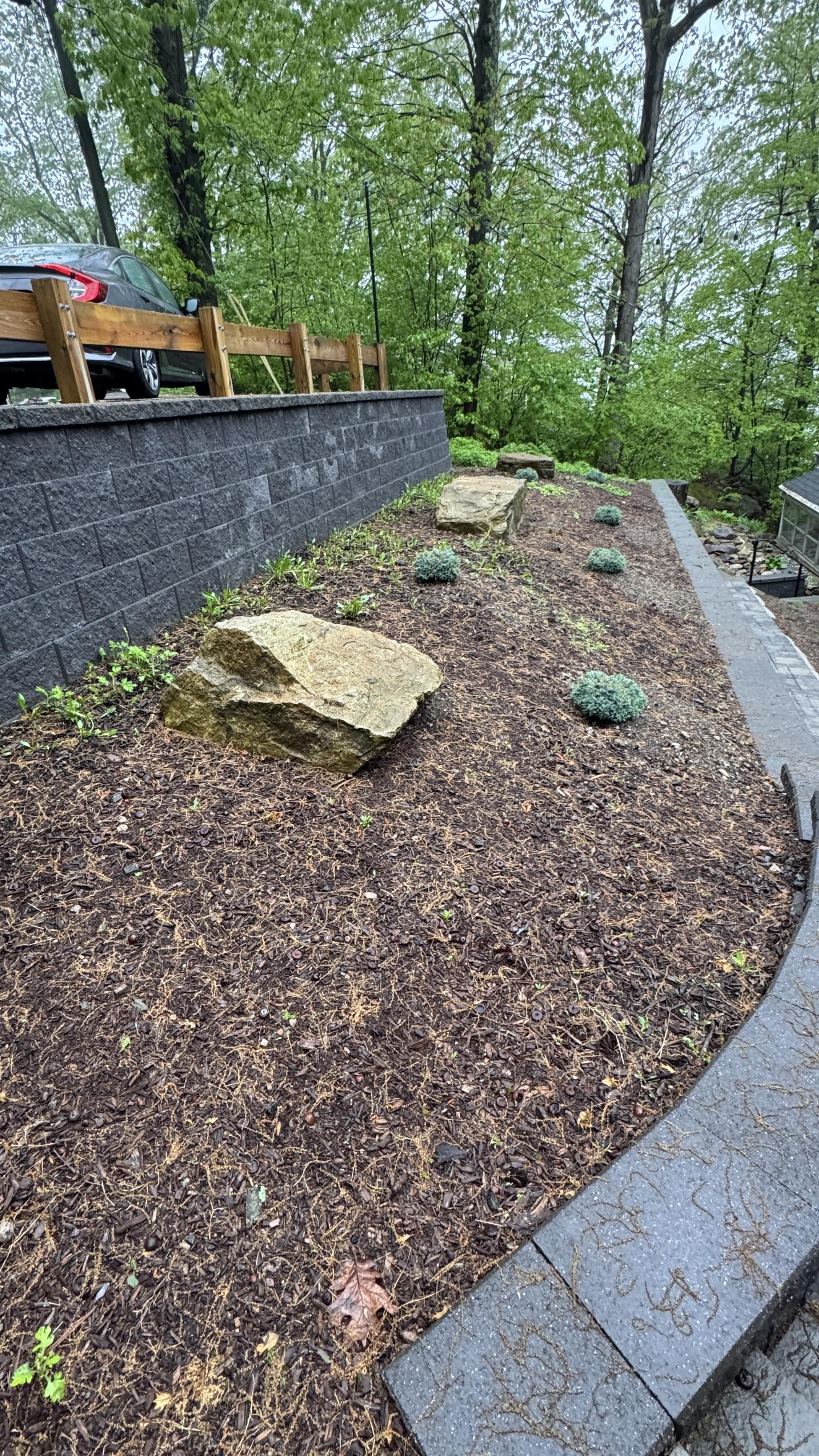 Blue fescue, creeping phlox, creeping juniper, in the front. Some taller native shrubs and/or grasses at the back along the retaining wall.