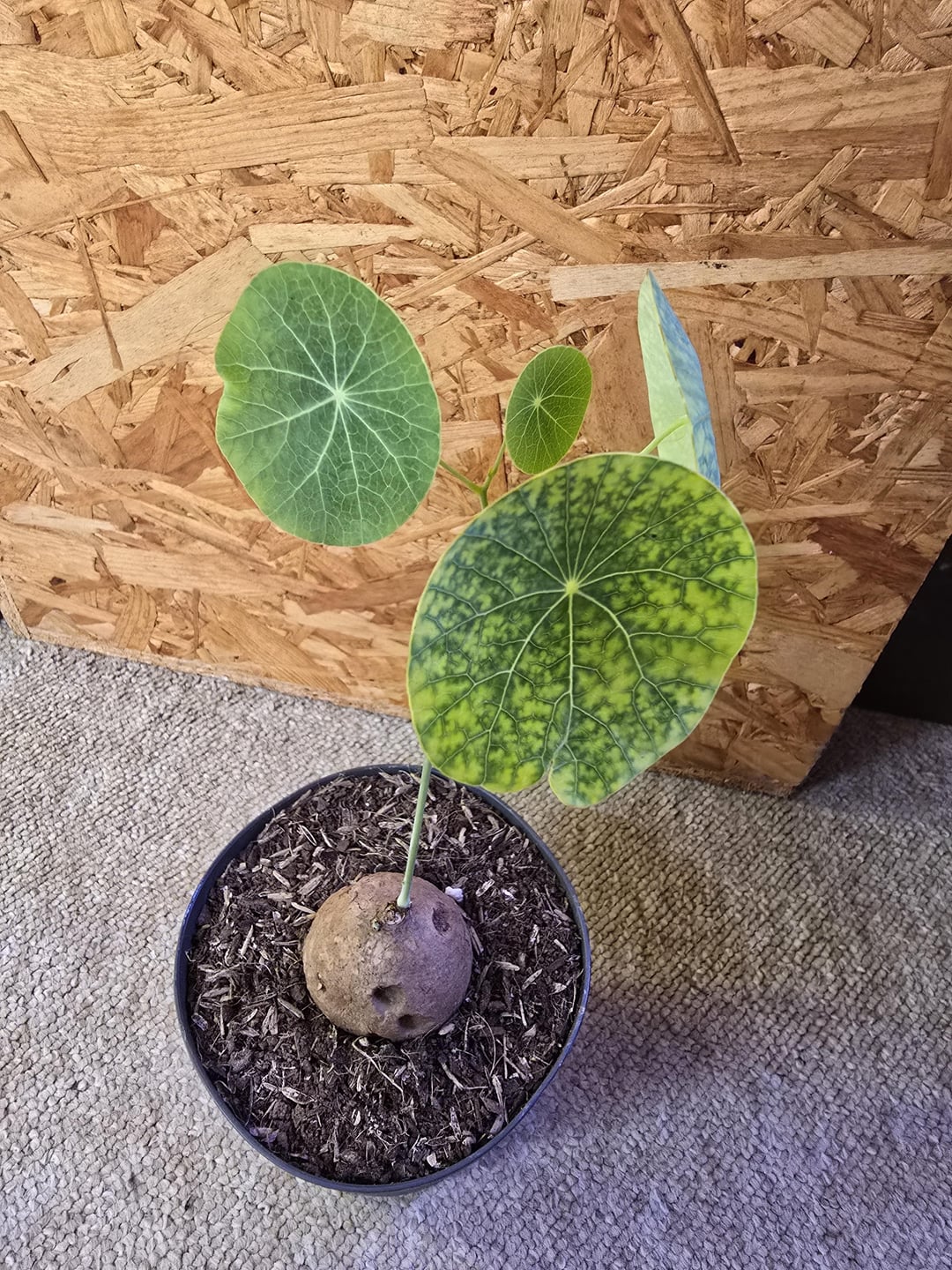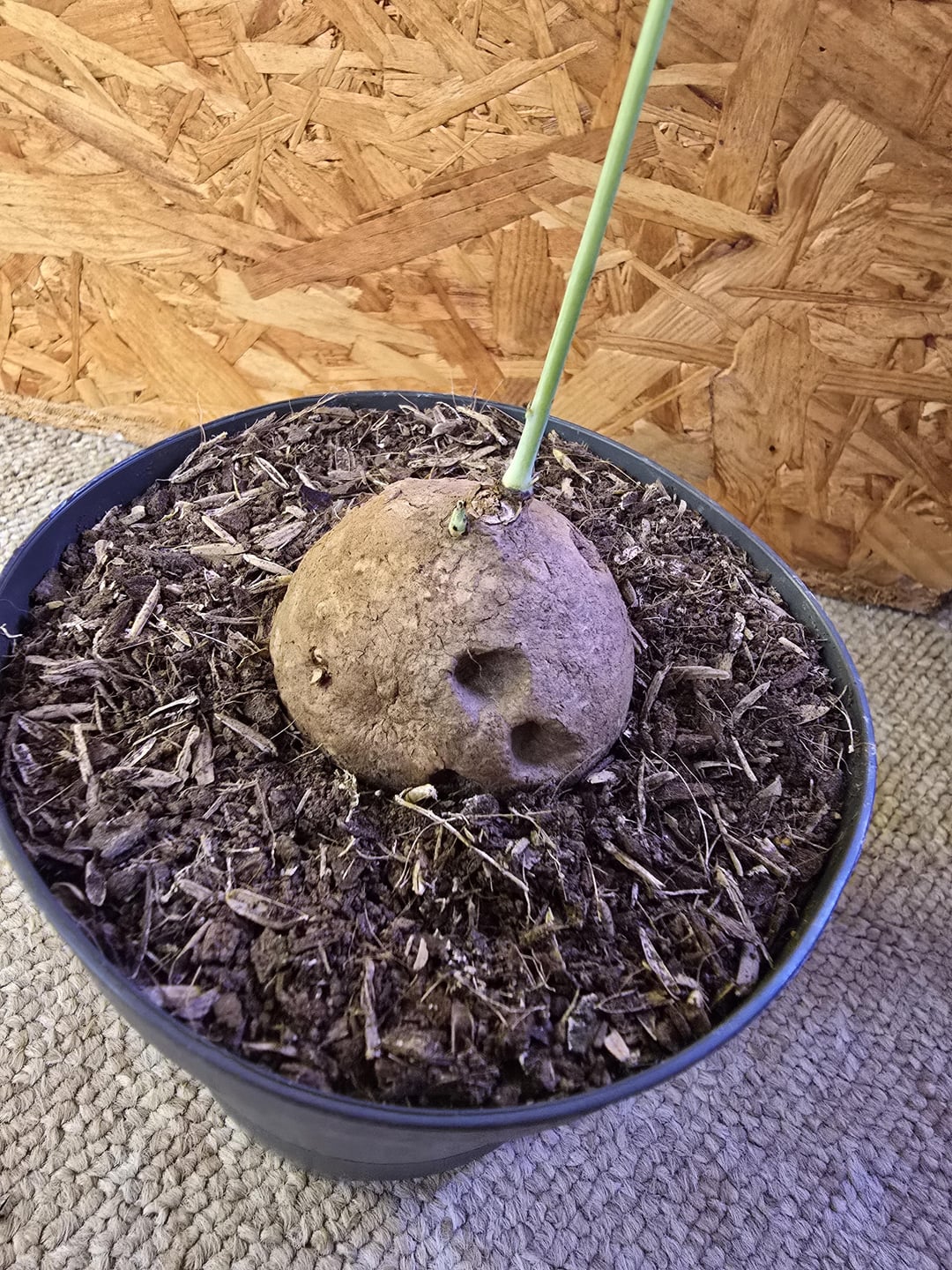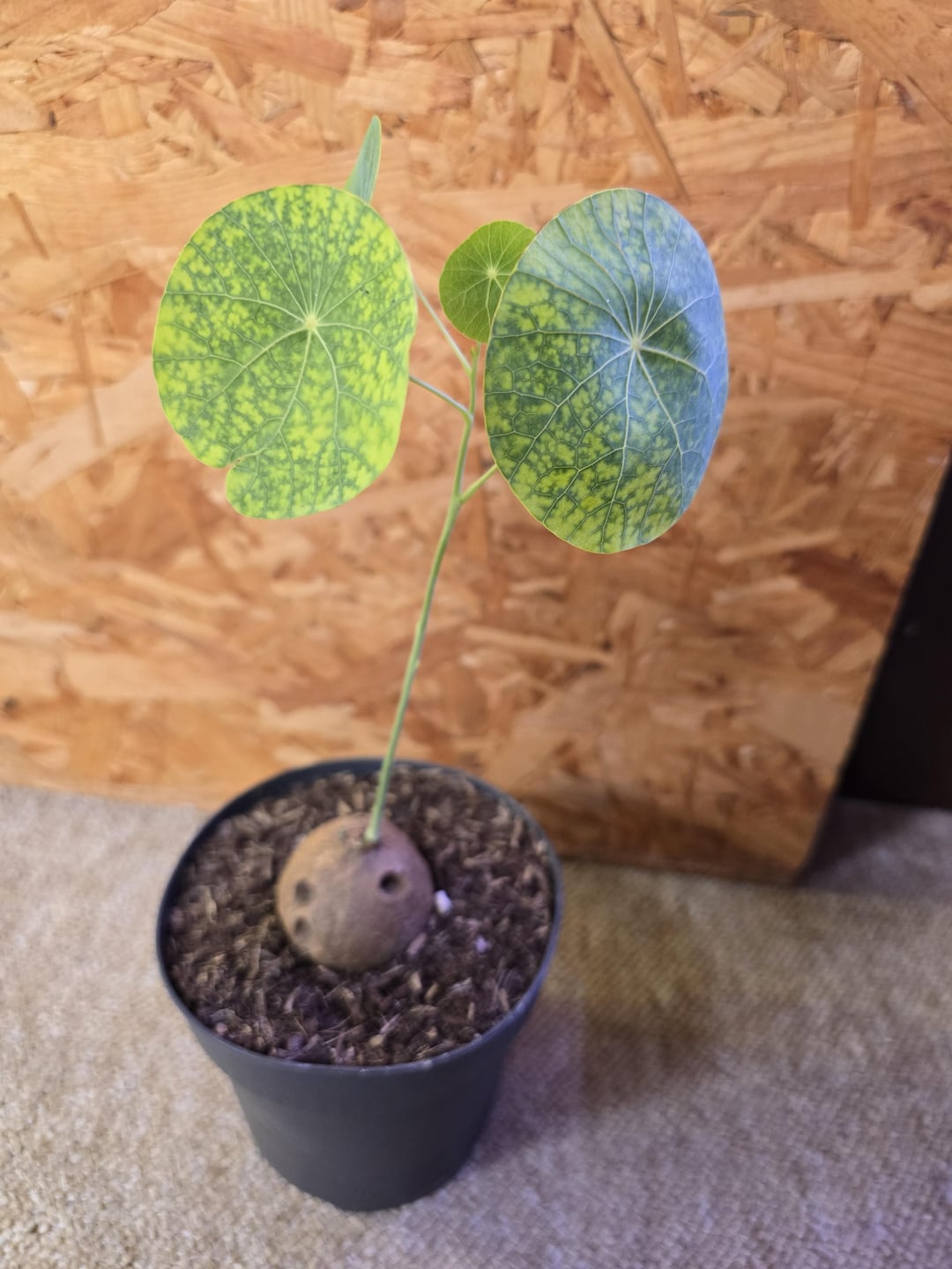 So, now to my question. Can anyone tell me what the discoloration could be a sign of? I read that I should give my Stephania erecta a warm, sunny spot with high humidity. That's why it's in my greenhouse with a heat mat, but without direct contact. There's metal in between. It arrived very dry. Since I'd read to be careful with watering, I held off on watering until about a week ago. Then I gave it a teeny tiny bit of water, because I was scared to give her a full watering. And then it gave me these discolored leaves, and the new growth at the caudex stopped growing… I haven't repotted it yet because the soil looks good to me, but I'm no expert on caudex plants. This is my first time; with any other plant, I would have changed the soil after about a few days. If anyone has any soil recommendations, I'd be happy to hear them. Thanks in advance for any tips!
